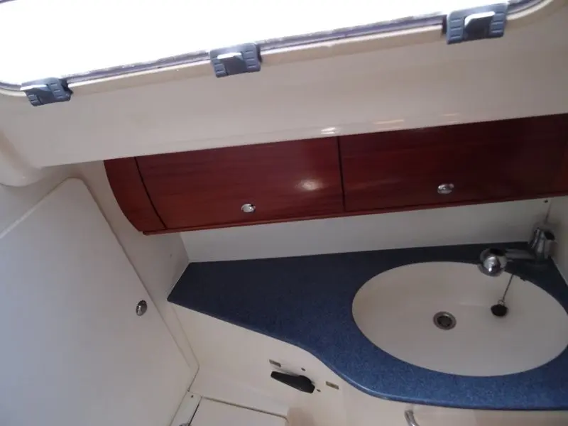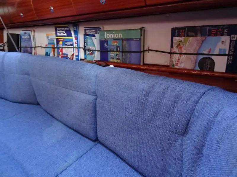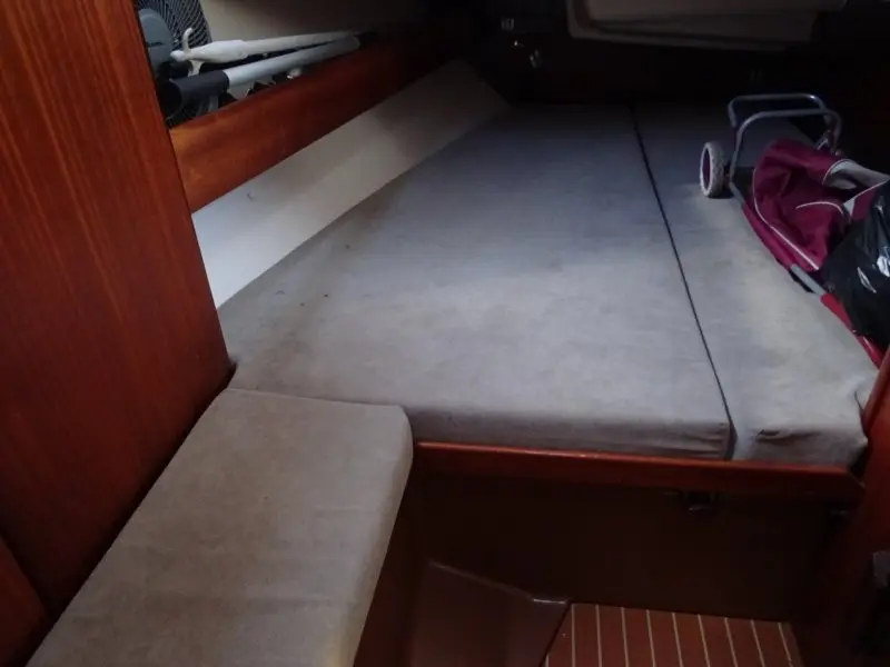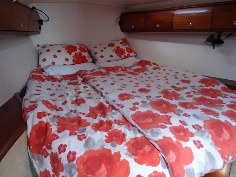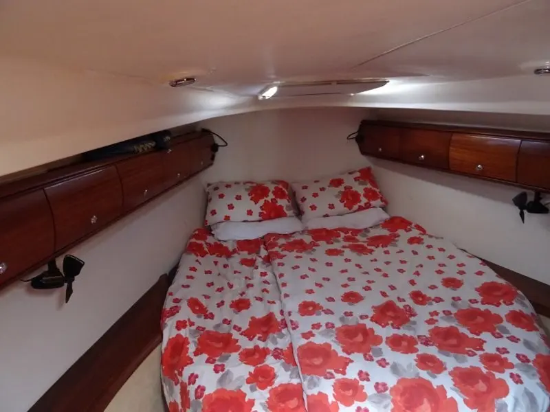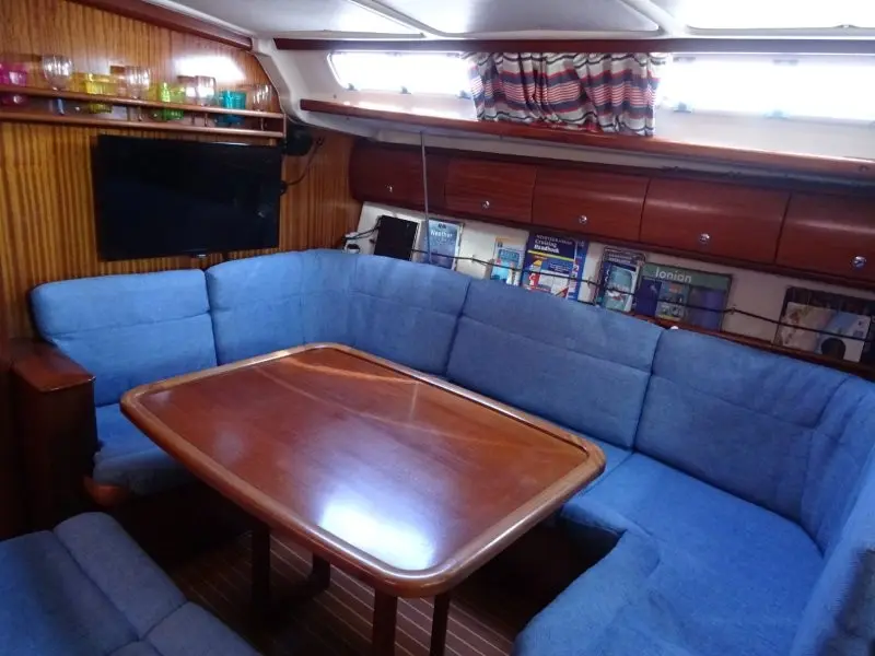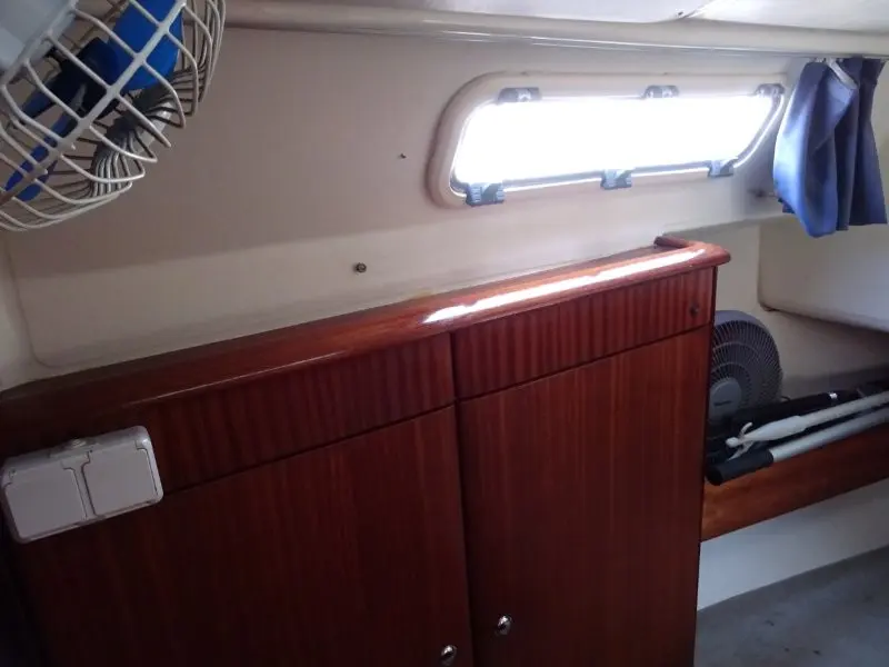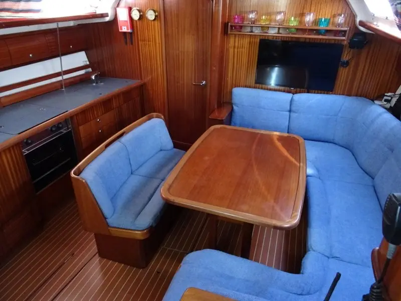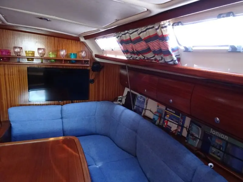 Accom for 6 in 3 double cabins. Wood joinered interior, Forward master V berth ensuit electric Jabsoc heads/shower, 2 x double aft cabins, 2nd heads/shower + holding tank. Quick 30 ltr hot water. Well equipped galley, Bavaria oven (2019), 2 burner hob, Isotherm fridge & freezer comp (new seawater cooled fridge system 2024)