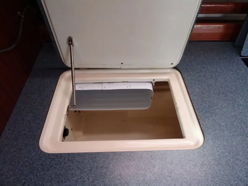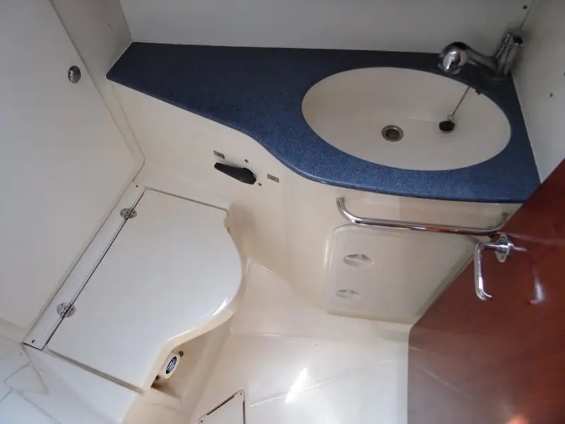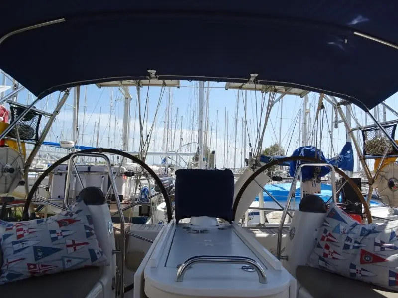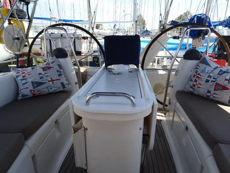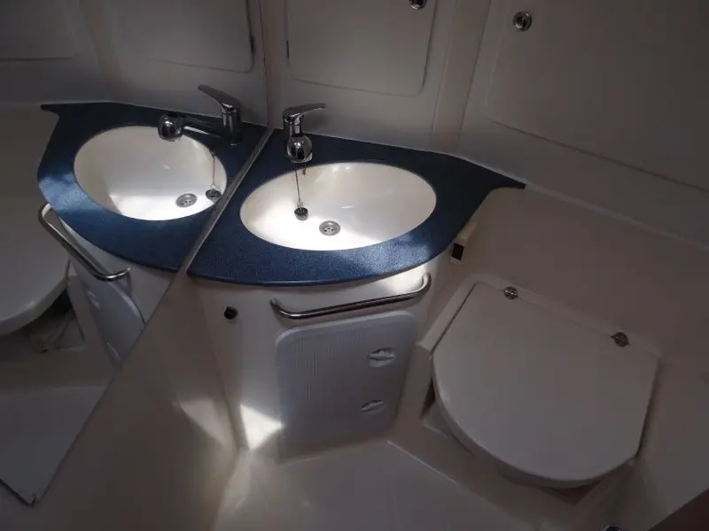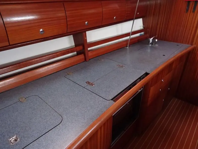 Quick 30 ltr hot water. Well equipped galley – Bavaria oven (2019), 2 burner hob, Isotherm fridge & freezer comp (new seawater cooled fridge system 2024)