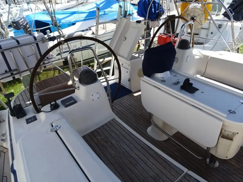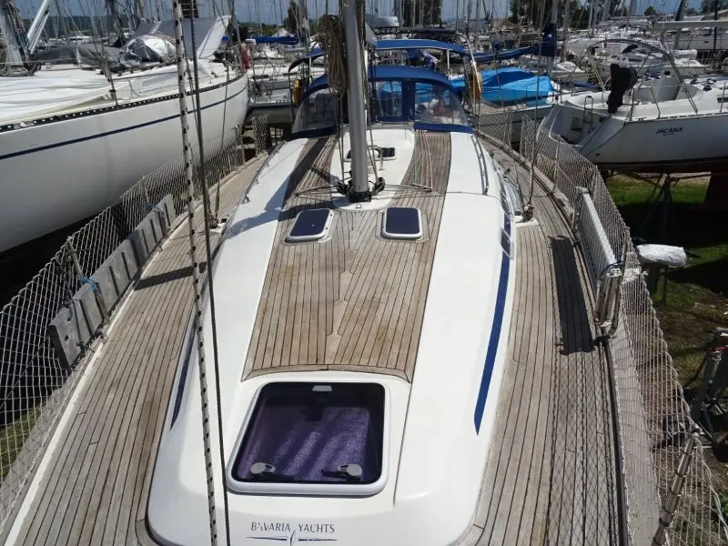 Bavaria 44 built 2002 to J&J design. Popular aft cockpit cruiser. Full Teak decks & cockpit. Fin bulb shoal keel (6ft), twin helm steering. Hull preventative treatment 2018 (2 coats 3m epoxy before Coppercoat applied). All through hulls & sea cocks replaced 2018,