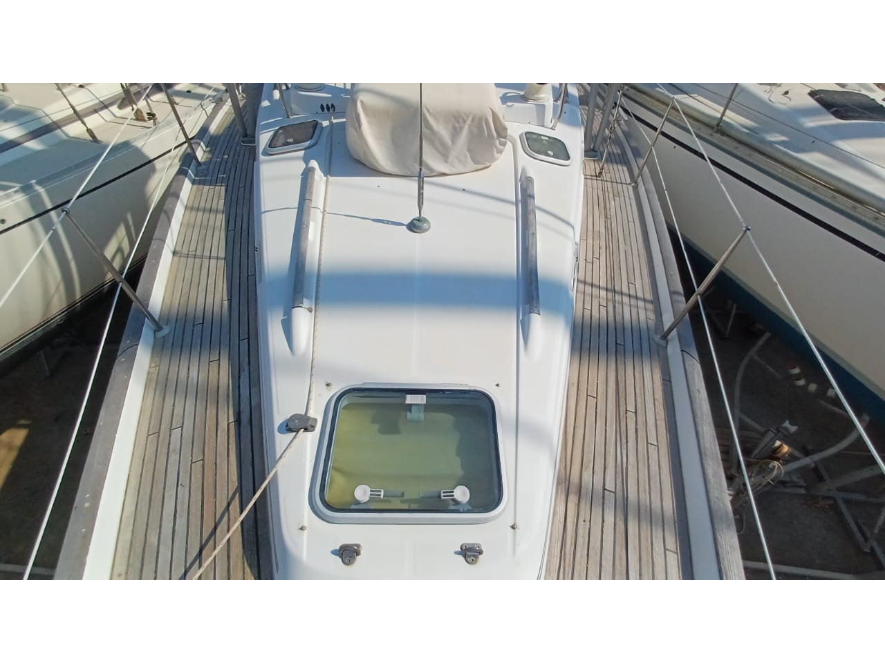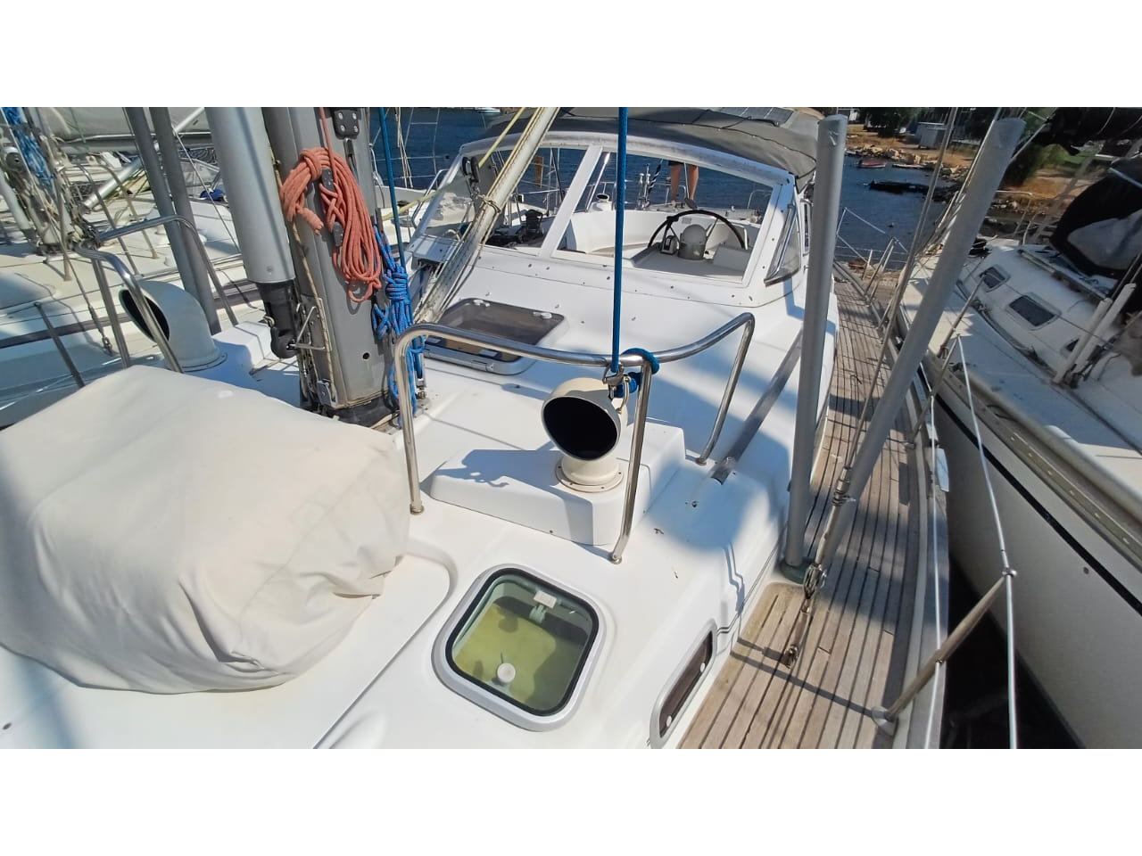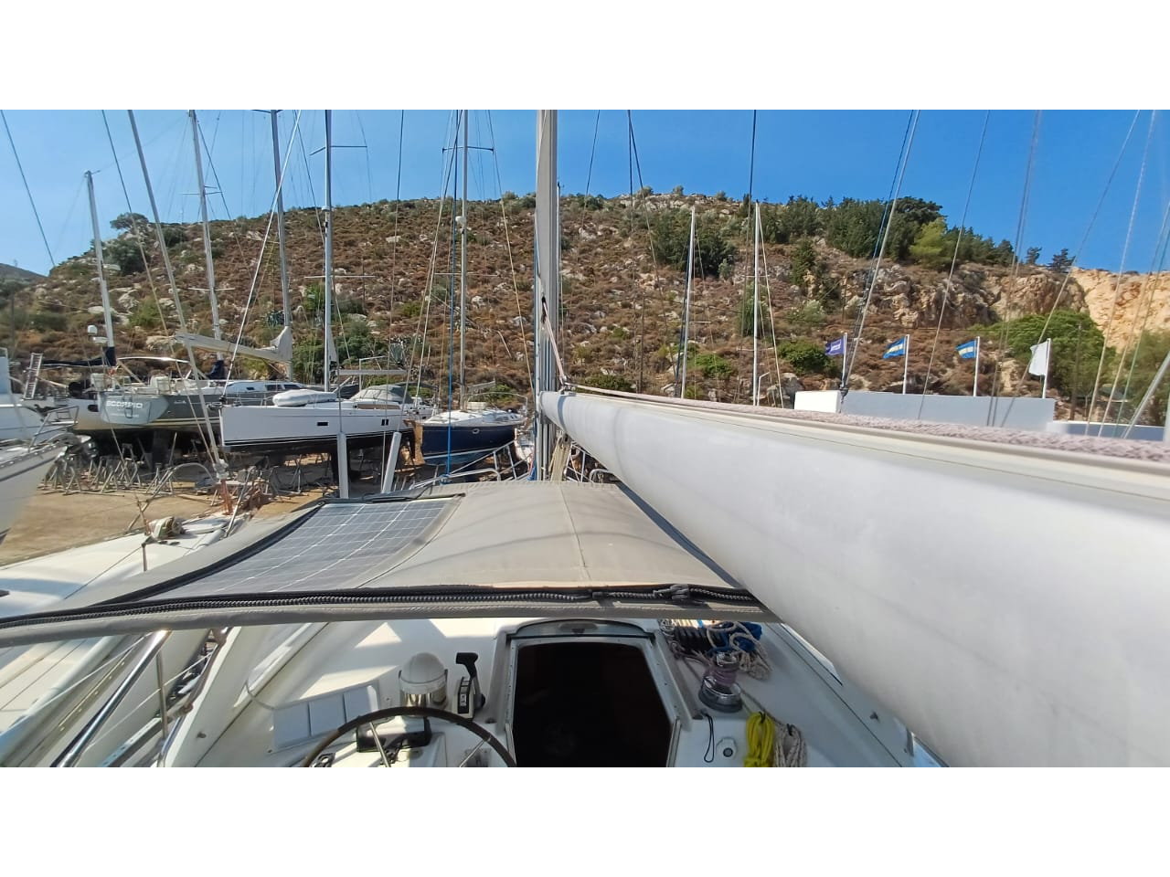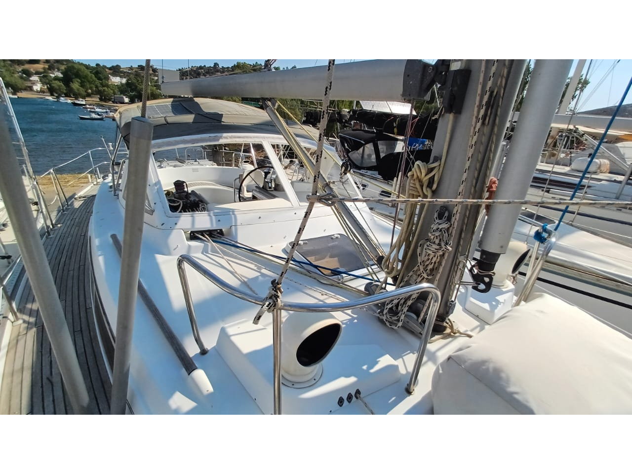 Performance and practicality are at the heart of this design. With a powerful 80hp Volvo Penta engine, upgraded Flexofold propeller, and bow thruster, maneuvering is smooth and controlled. Her in-mast furling main, furling genoa, and robust sail inventory ensure easy handling for shorthanded crews. The Z Spar rig, renewed standing rigging (2014/2022), and full offshore safety inventory make her ready for serious passagemaking. Her keel with wing bulb and semi-balanced rudder offer excellent tracking and a forgiving helm feel offshore.