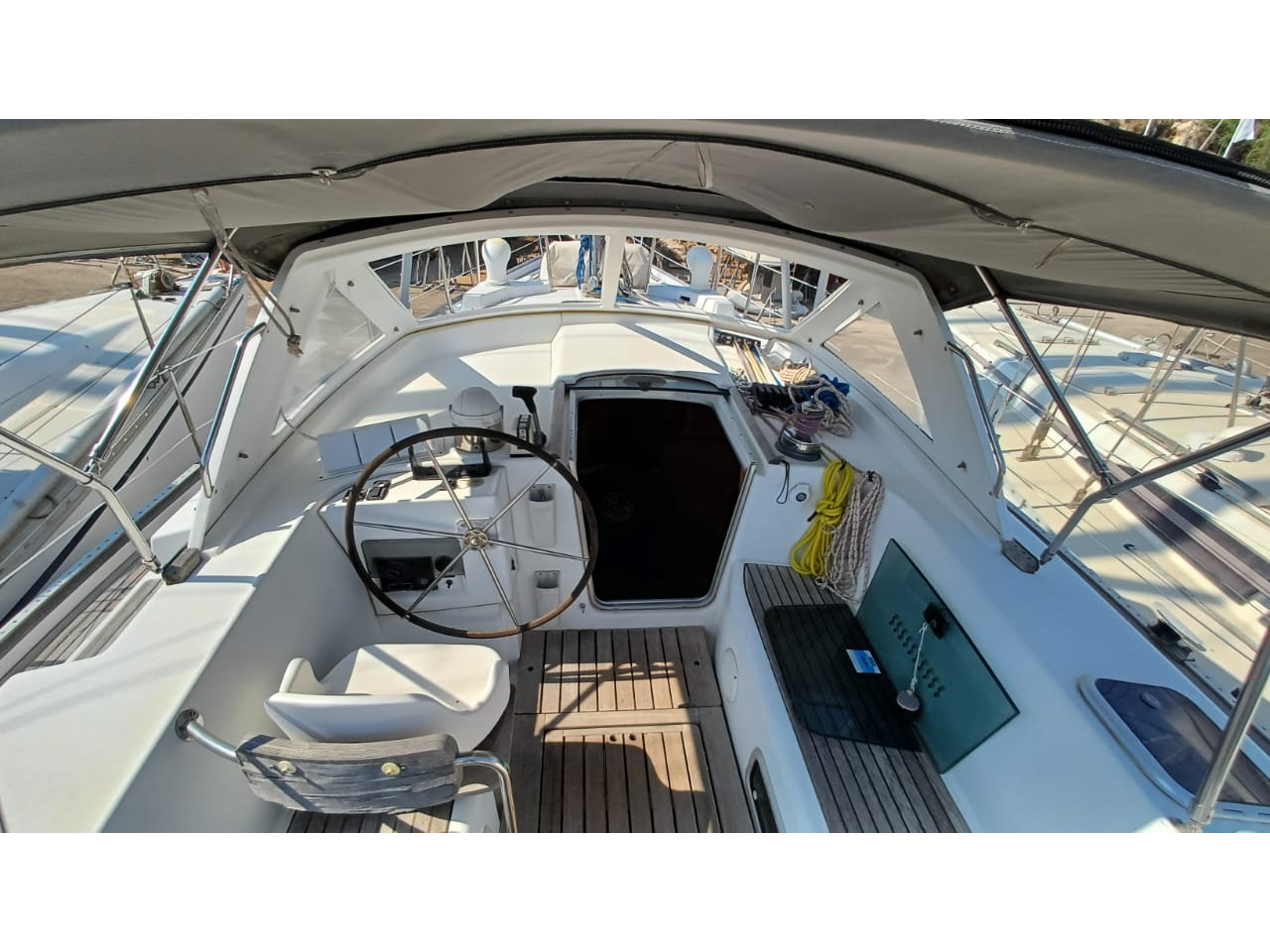 The Beneteau Oceanis 44CC is a rare center cockpit cruiser from the board of Bruce Farr, designed for confident offshore passage-making with all the comfort and elegance of home. Built in 1999 by Beneteau and extensively maintained, she features a pear wood interior by Armel Briand, a luxurious aft owner’s suite with en-suite bath and shower, and a bright, spacious saloon—making her an ideal long-term liveaboard or cruising yacht. The center cockpit layout offers excellent visibility, safety under sail, and superb separation between guest and owner accommodation.
