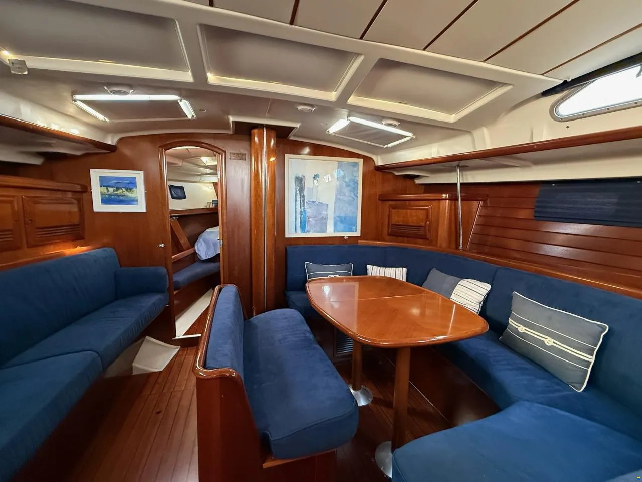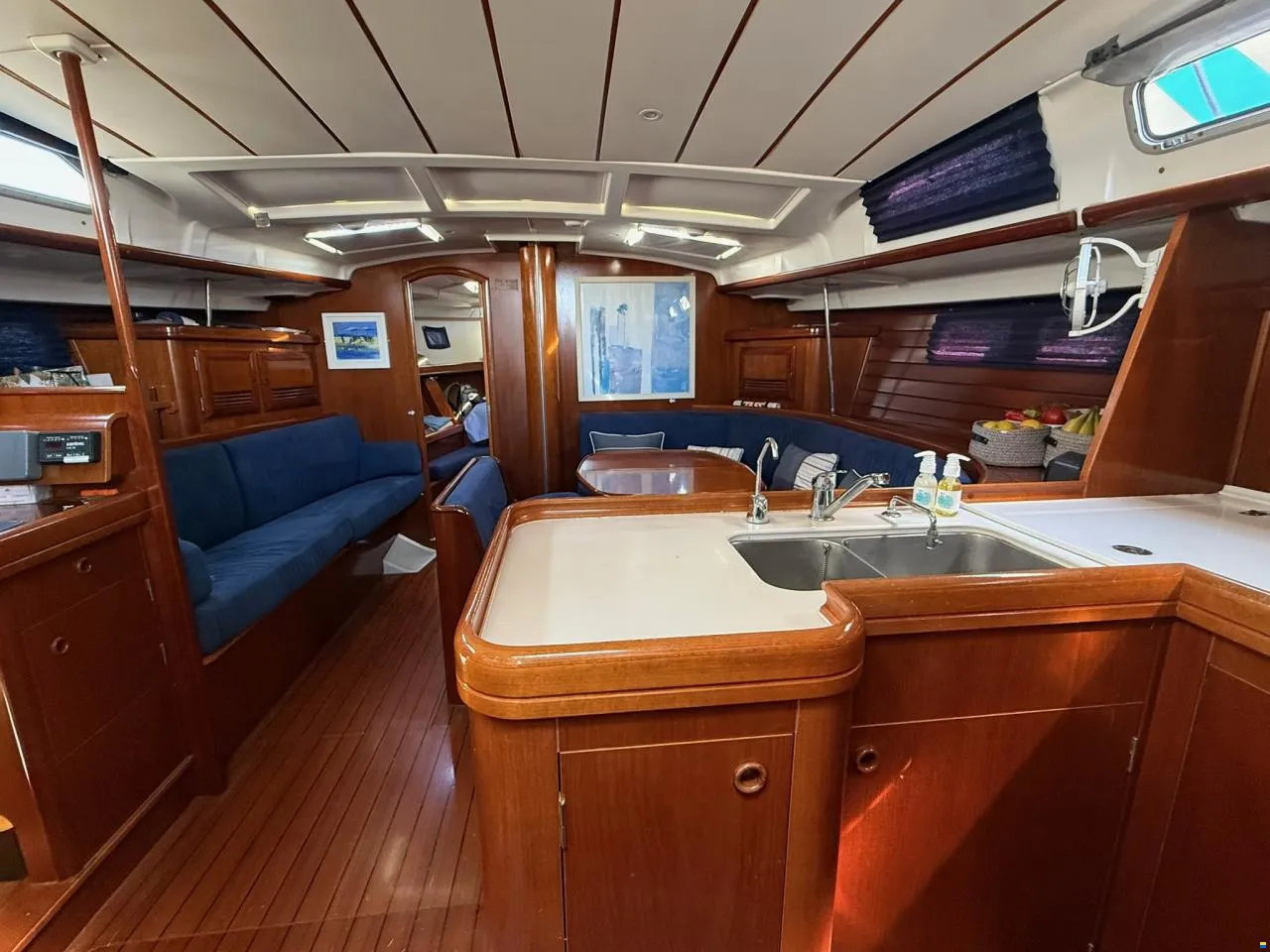 Step below deck and the atmosphere is warm and inviting. Rich wood joinery, three spacious cabins, and dual heads with showers provide comfort and privacy. The galley is fully equipped for extended living, while generous ventilation ensures a bright, airy feel.
