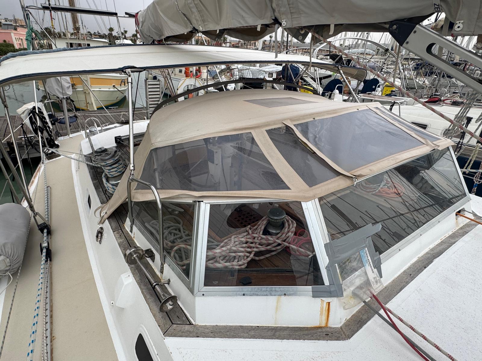 An electric windlass and Bügel anchor with 60 metres of chain simplify anchoring. Meanwhile, a sprayhood and bimini provide protection. A tender with a 6hp outboard, serviced in 2024, ensures easy shore access.