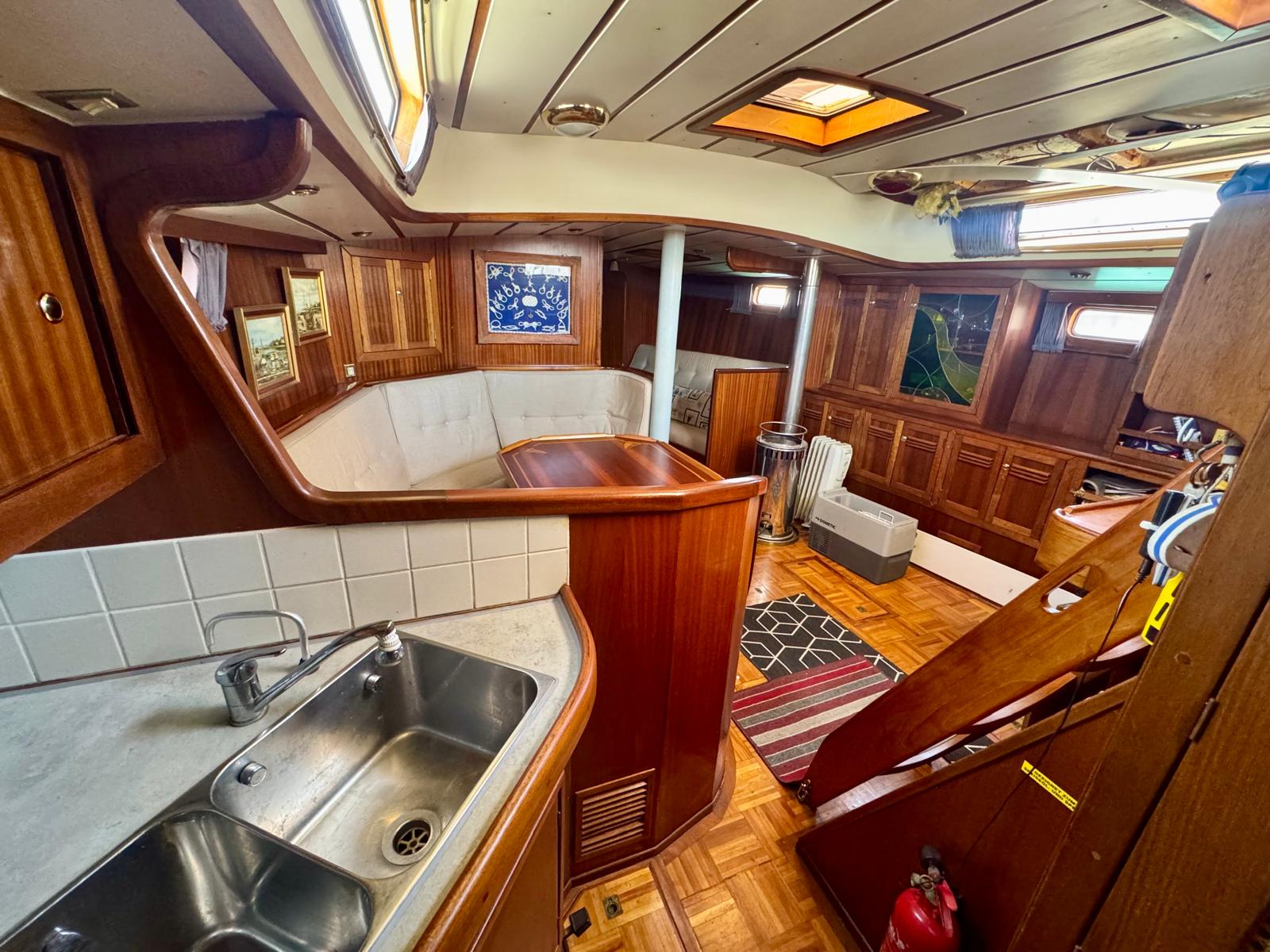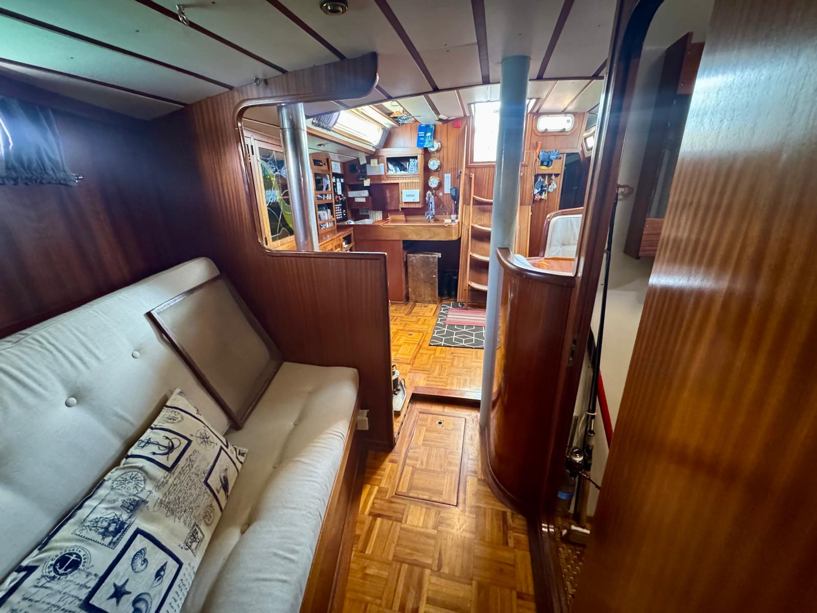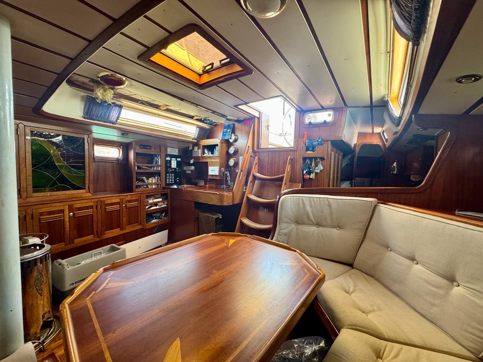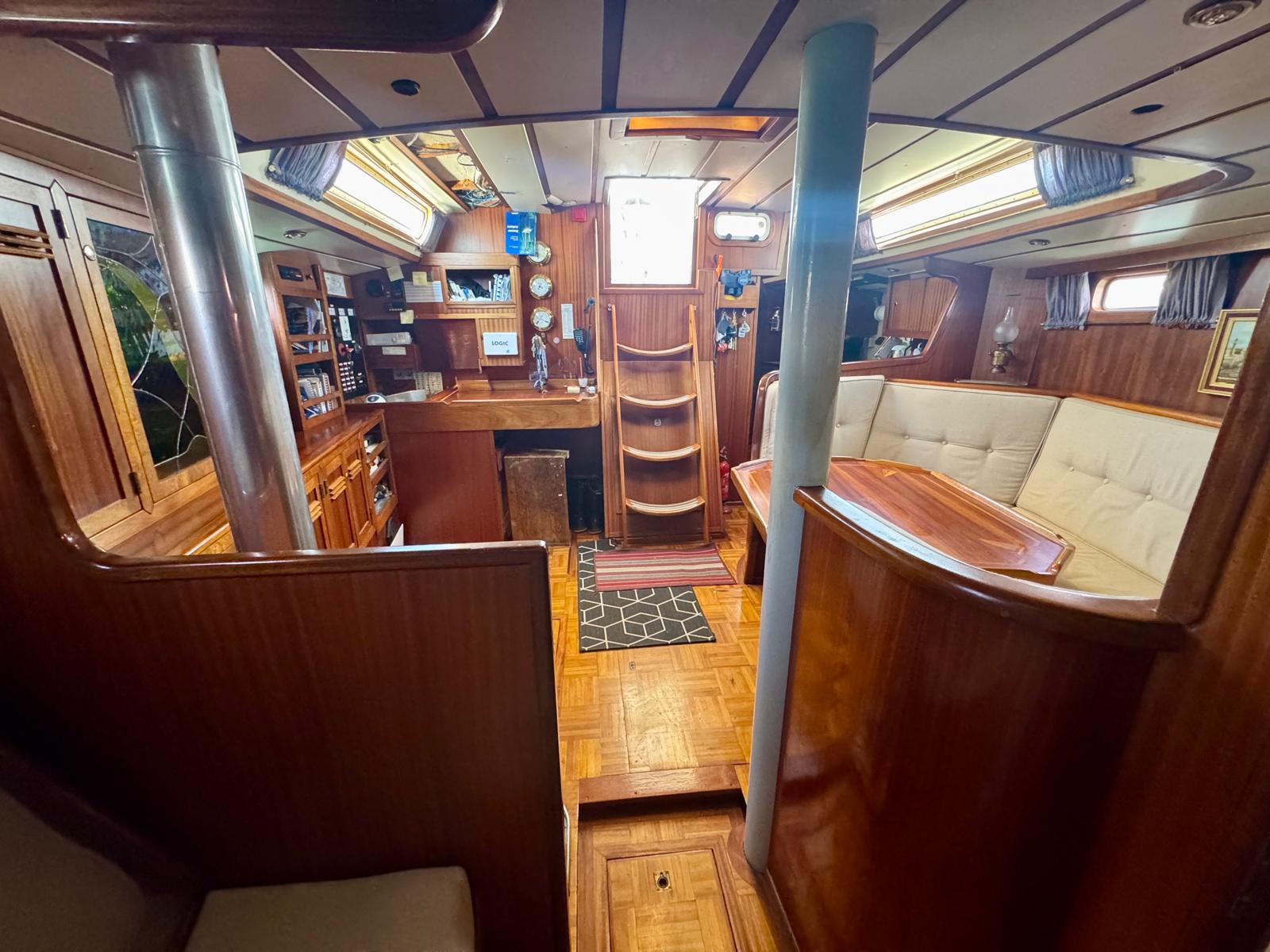 Her cutter-stay rig includes aluminium spars and stainless standing rigging. The sail inventory features a slab-reefed mainsail, furling genoa, and staysail. As a result, she remains versatile and manageable in varied conditions.