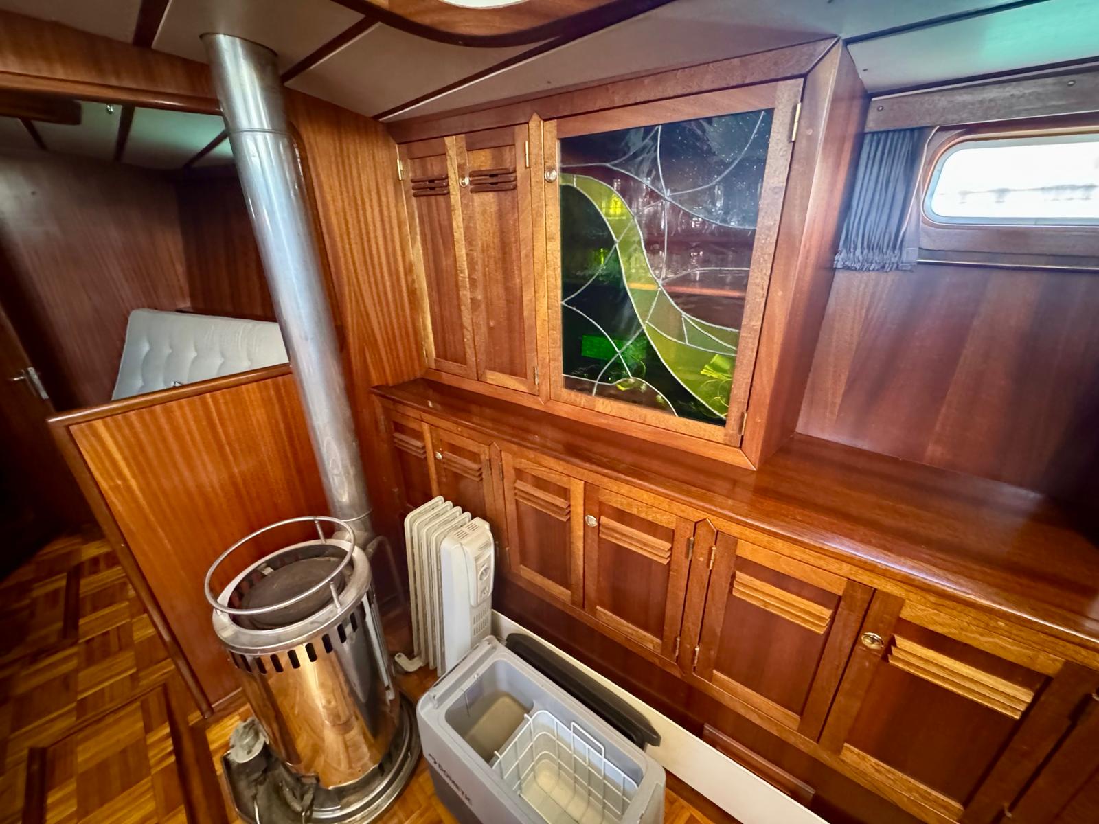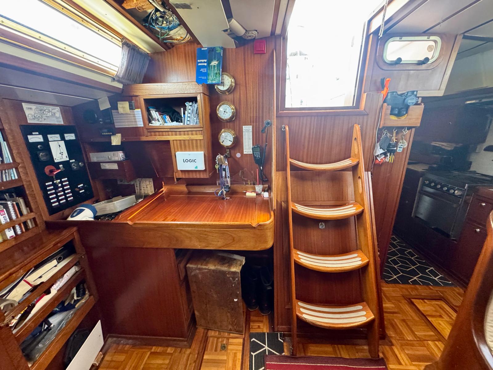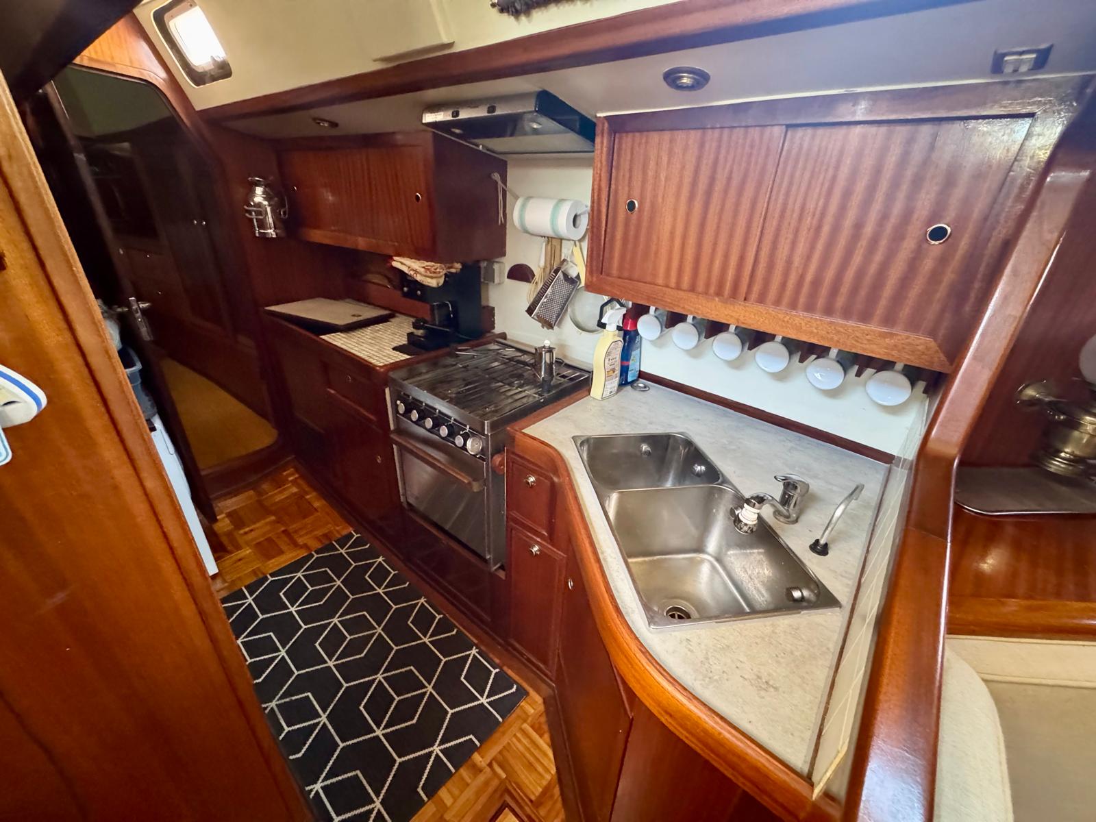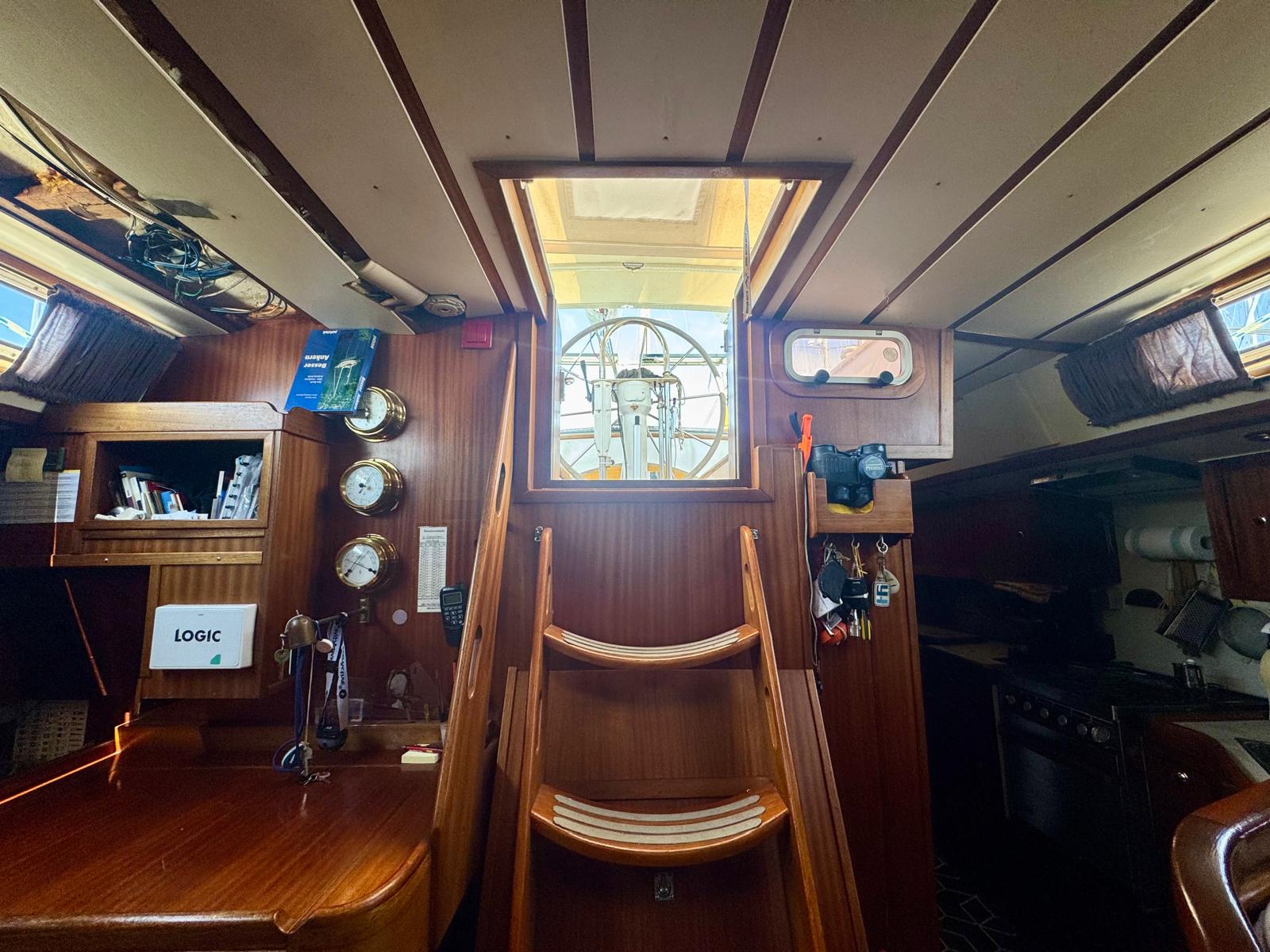Her cutter-stay rig includes aluminium spars and stainless standing rigging. The sail inventory features a slab-reefed mainsail, furling genoa, and staysail. As a result, she remains versatile and manageable in varied conditions.