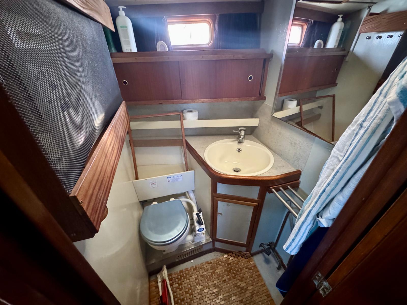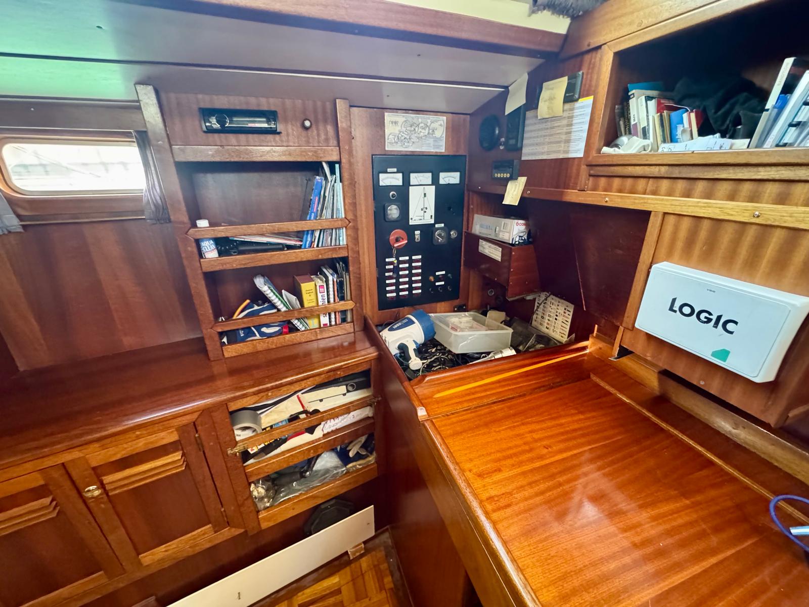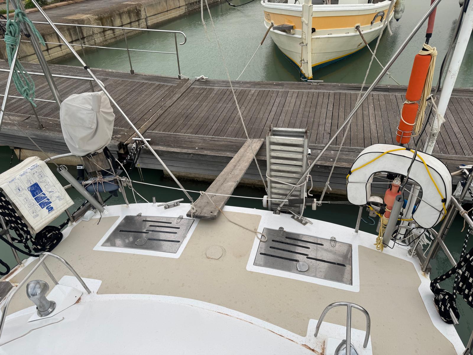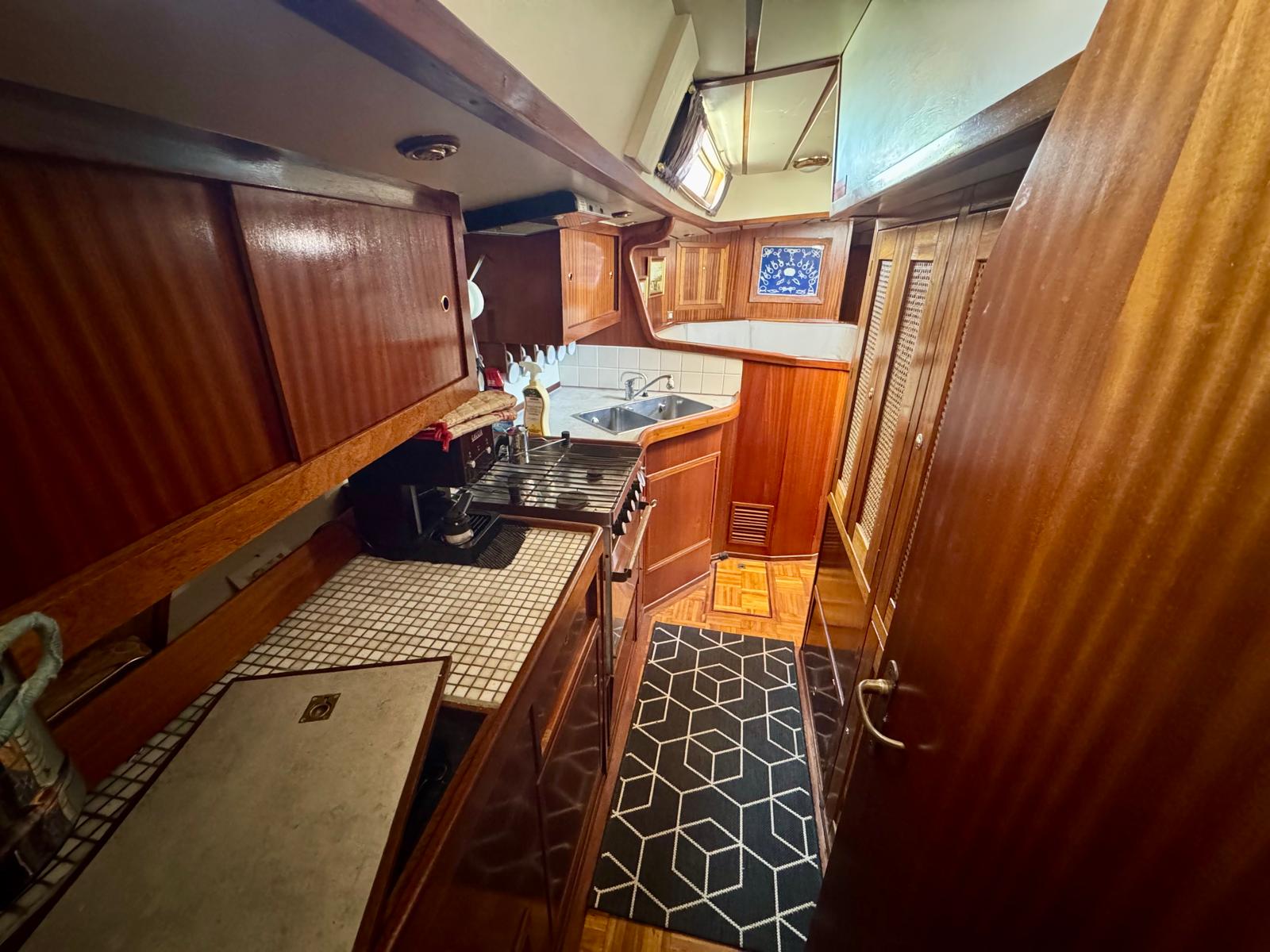 Her cutter-stay rig includes aluminium spars and stainless standing rigging. The sail inventory features a slab-reefed mainsail, furling genoa, and staysail. As a result, she remains versatile and manageable in varied conditions.