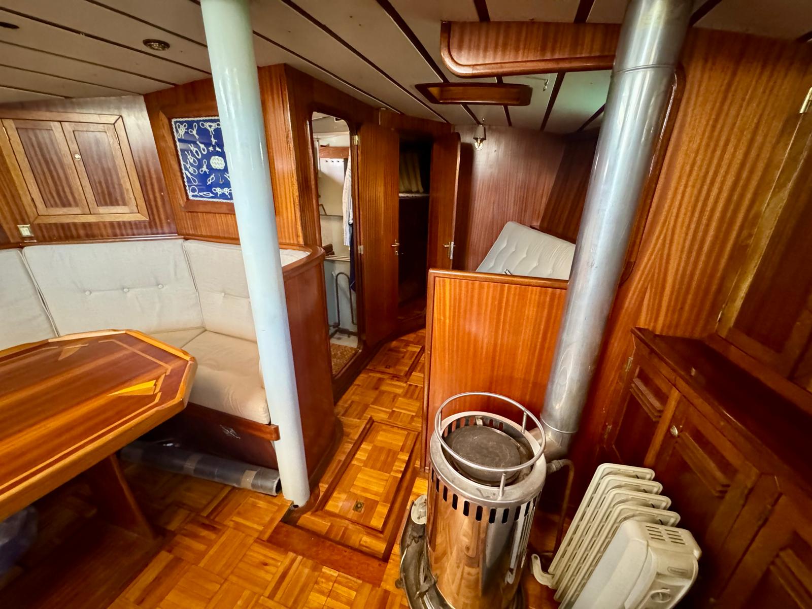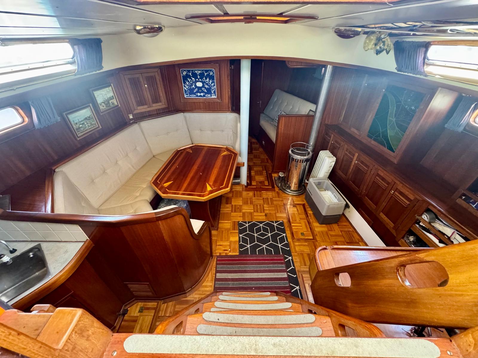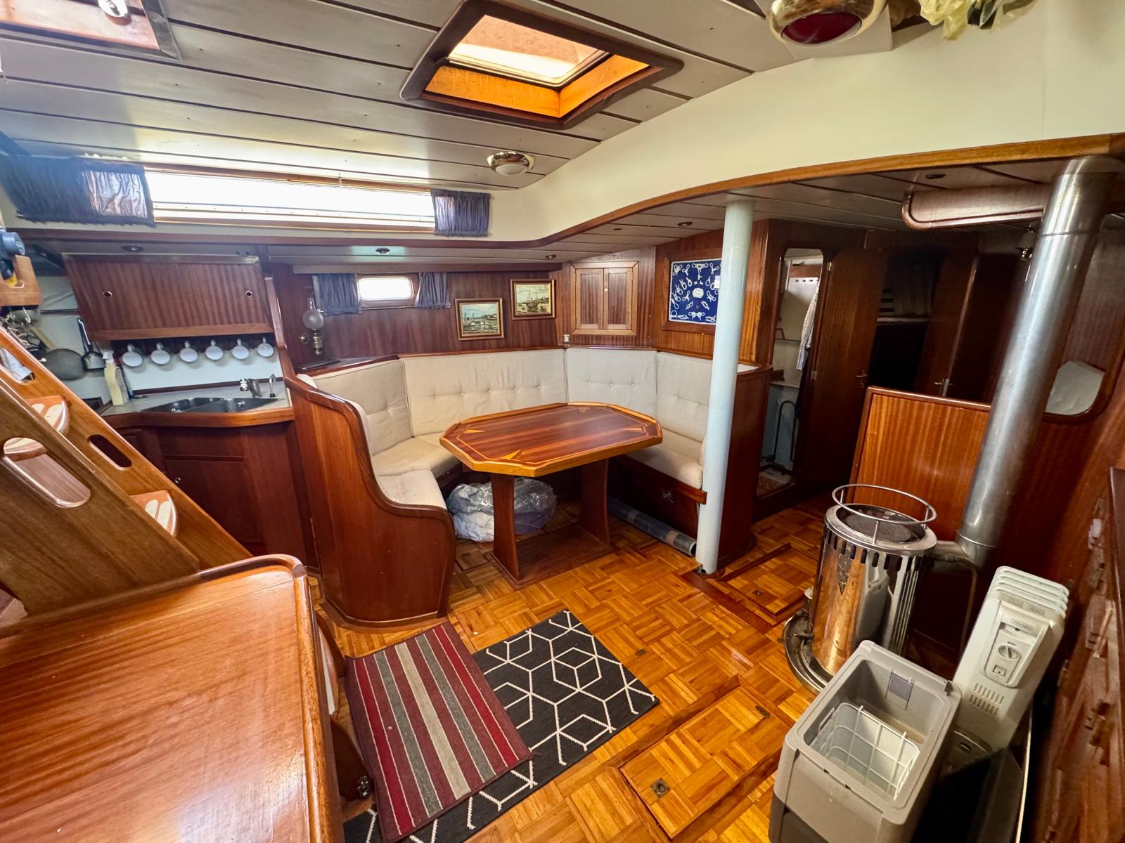 She offers berths for up to six across two cabins and the saloon. The layout suits families or long-term cruising. In addition, heating and air conditioning maintain comfort in different climates.