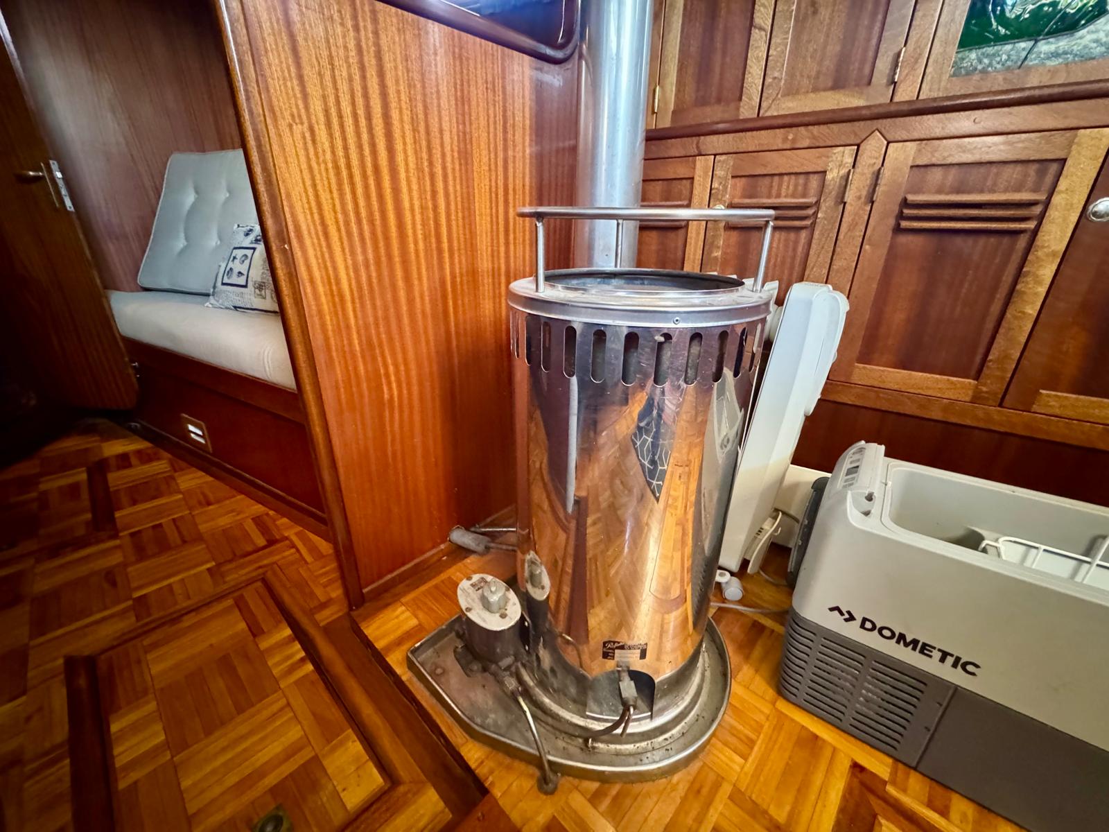 A 40hp Mercedes OM636 diesel engine provides reliable performance. Recent updates include a new diesel filter and impeller. Moreover, a Silent Wind generator and Eco Sistems Splash 25 watermaker enhance onboard independence. Solar panels and shore power support her 12v, 24v, and 110v systems.