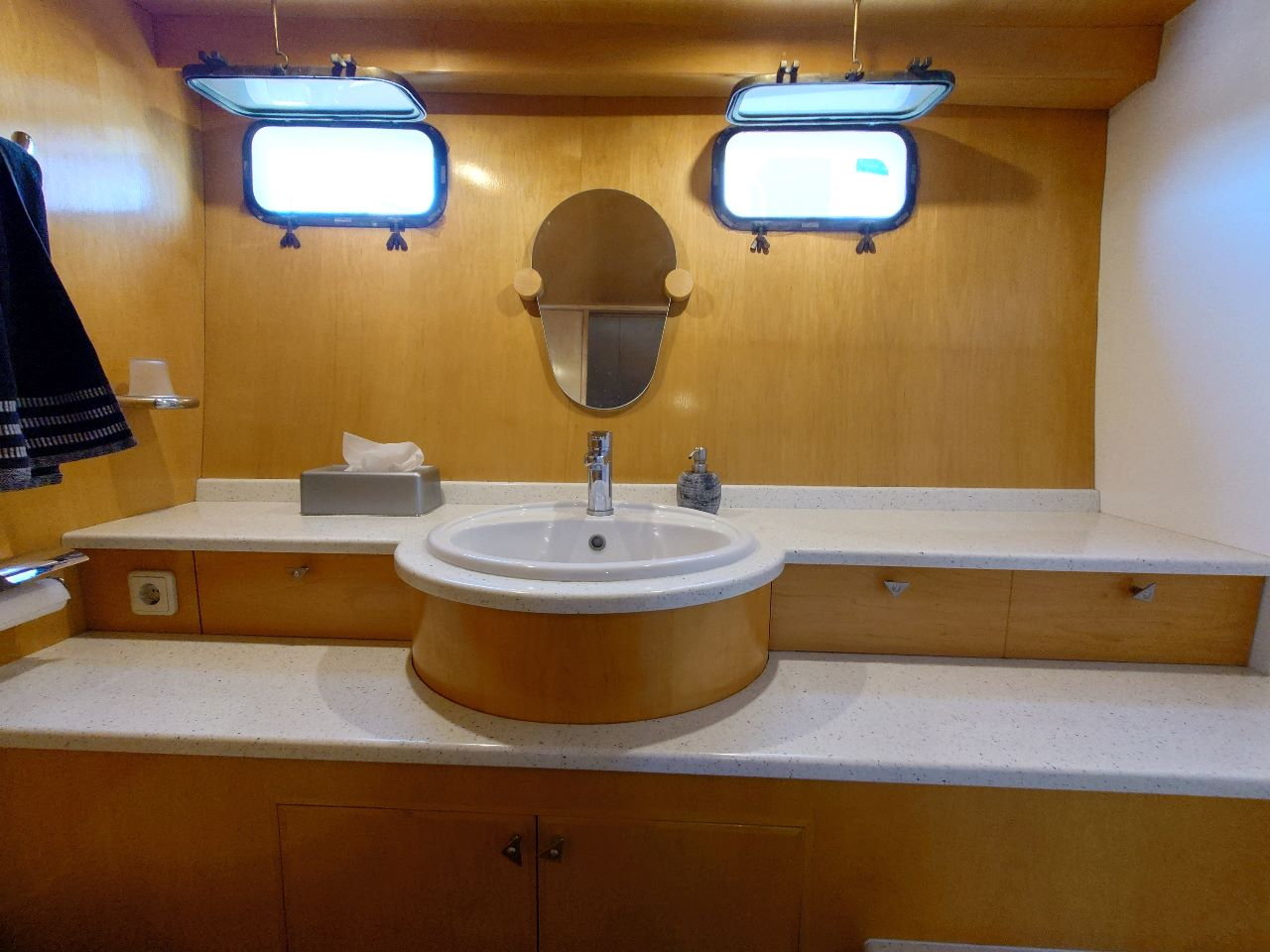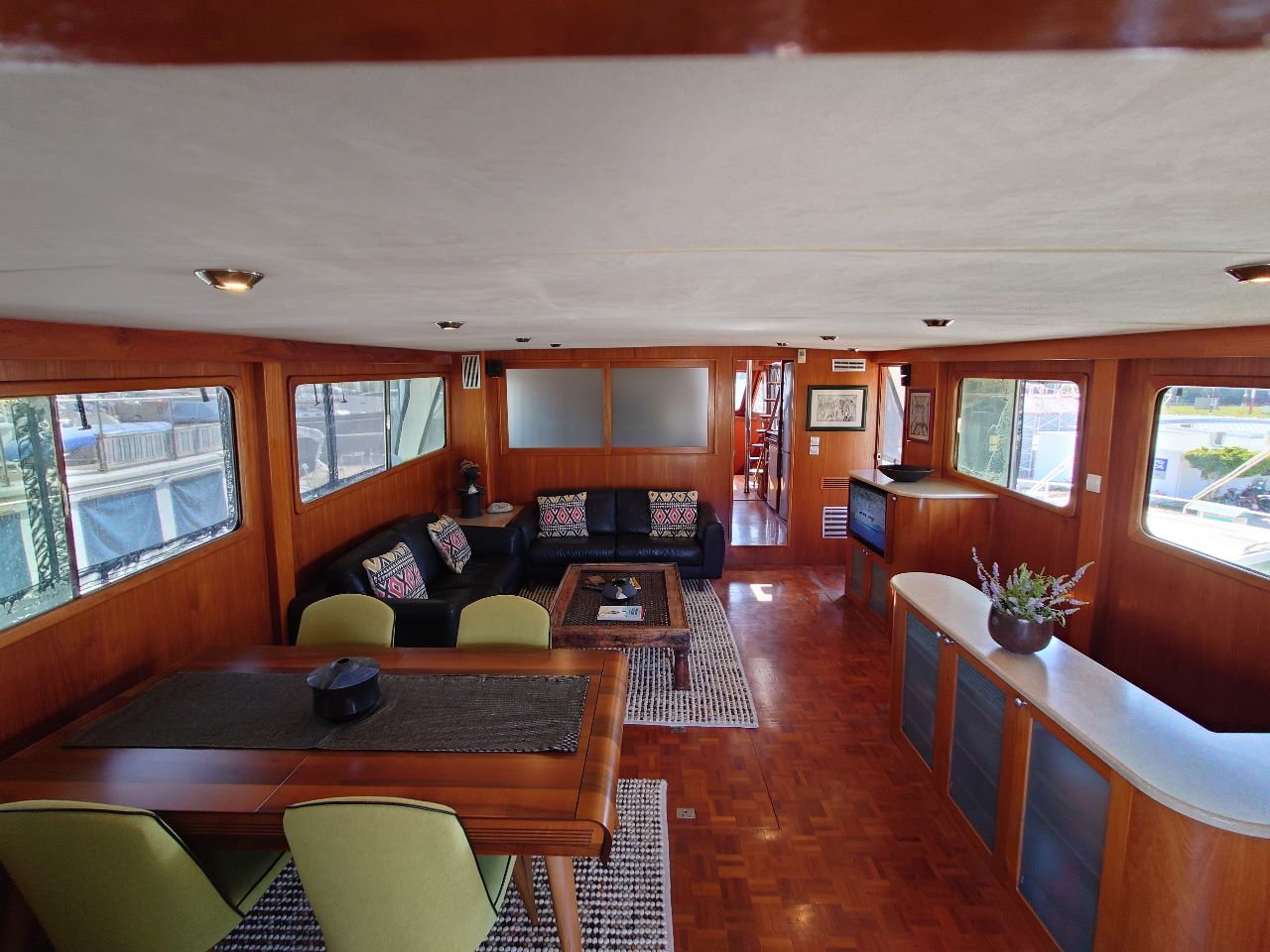 Below deck, the atmosphere is warm and inviting. Ensuite cabins have been upgraded, the galley is fully equipped, and the saloon includes a Bose Acoustimass sound system. As a result, she delivers everything needed for extended cruising or full-time living.