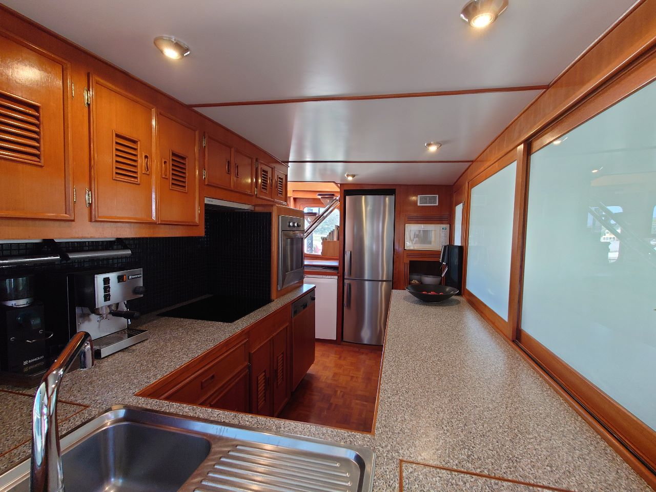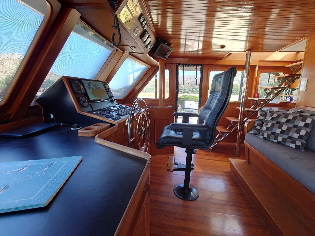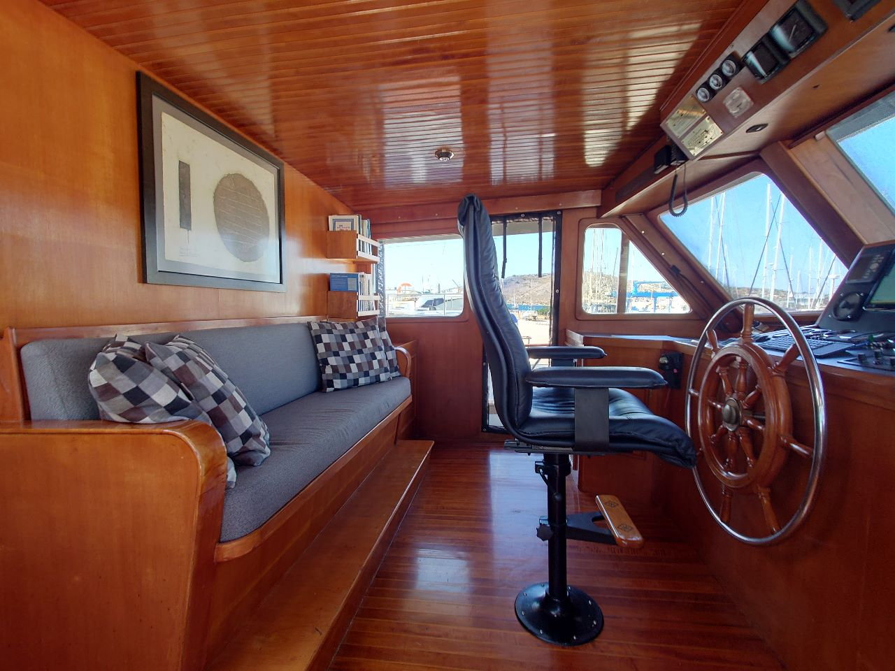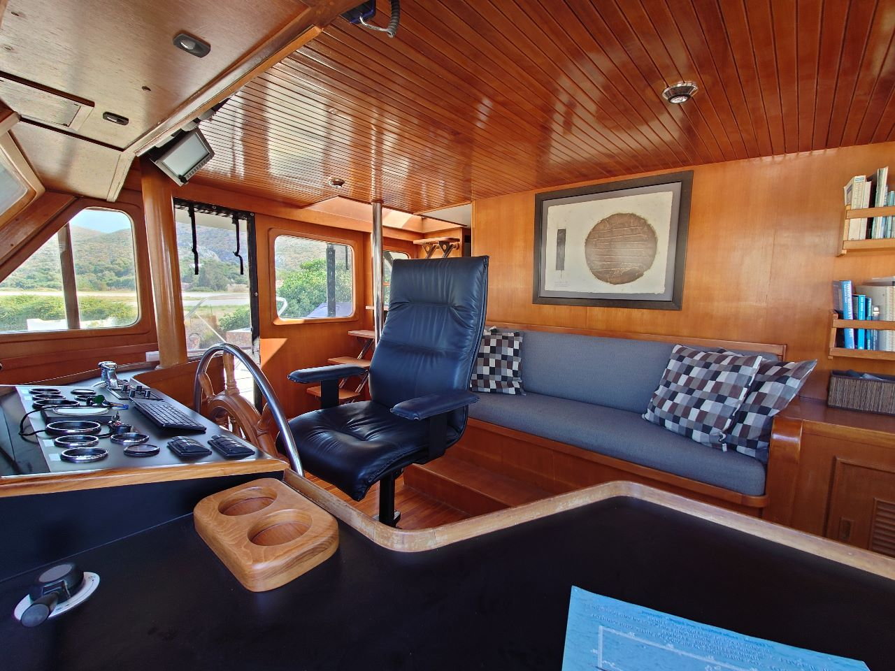 Thanks to a Kohler 9kVA generator, 1640W solar array, lithium battery bank, and Spectra Newport MkII watermaker, this trawler operates confidently off-grid. ZF Marine electronic controls further improve her usability, especially in tight quarters.