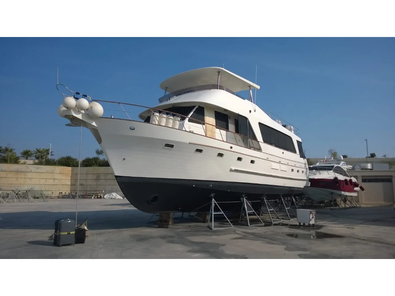 She features a solid fibreglass hull, teak-laid decks, GRP superstructure, and a custom carbon fibre hardtop with a matching swim platform. A 2023 structural survey confirmed her excellent condition (report available). Meanwhile, twin Detroit Diesel 8V71TA engines (870hp combined) provide dependable propulsion, with Wesmar hydraulic stabilisers and bow/stern thrusters enhancing handling and comfort.
