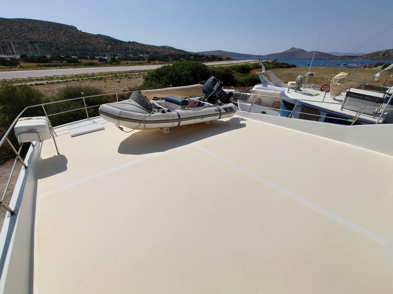 Teak laid on main deck and flybridge fwd section