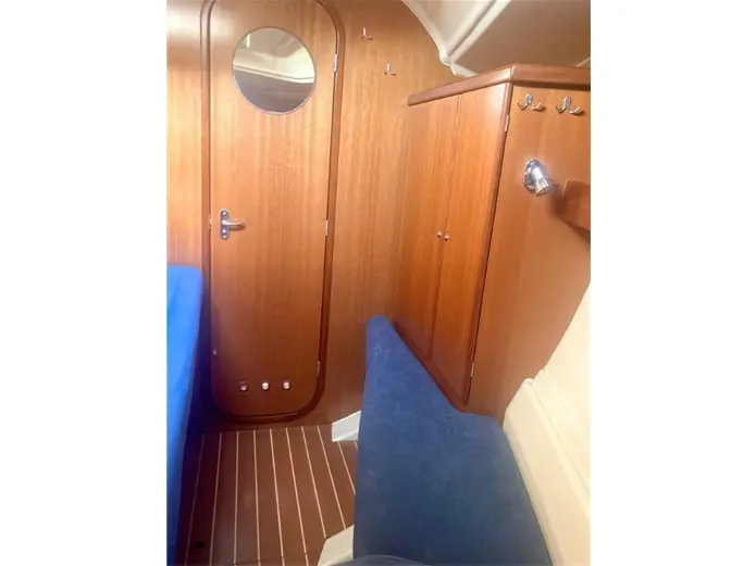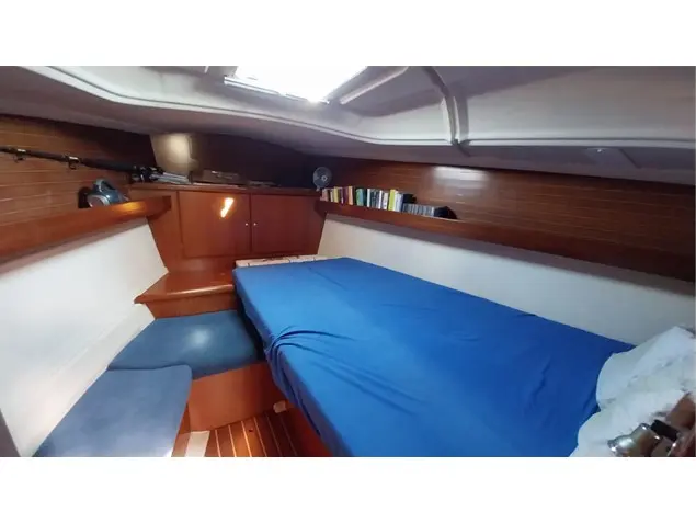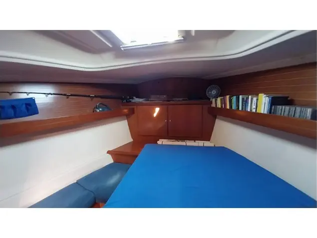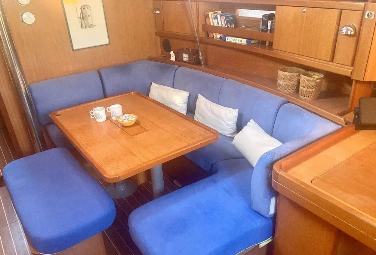 Inside, this 2-cabin version sleeps four in comfort. The forward cabin has a generous double berth, while the aft cabin offers additional space for guests or family. The interior has been recently renovated and now features stylish blue Alcantara upholstery. The saloon includes U-shaped seating, a linear galley with a gas cooker, fridge, and stainless-steel sink—everything you need for extended cruising.