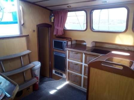 Accommodation is practical and comfortable. She sleeps six across two private cabins and convertible saloon seating. The aft master has an island berth, while the forward V-berth is adjacent to a separate heads with shower. The deckhouse saloon includes a compact galley with a 3-burner hob, gas oven, dual fridge/freezers, microwave, and pressurised hot water. Heating is provided by a diesel drip-feed unit and electric skirting heater.