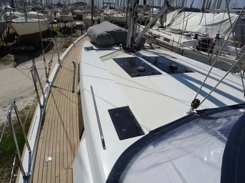 Hanse 455 built by Hanse Yachts, Germany (2015) Aft cockpit cruiser to design by Judel/Vroljik & Co. White G/FRP Vinylesther sandwich Hull, Deck/sandwich & Structure. Fold down stern bathing platform. Full teak decks. Twin wheel steering (Carbon Nautica)Standard fin keel – cast iron. Blade rudder. Deep fin keep 7’510 x new hull fittings TruDesign (2025)New Anti-foul 04/25