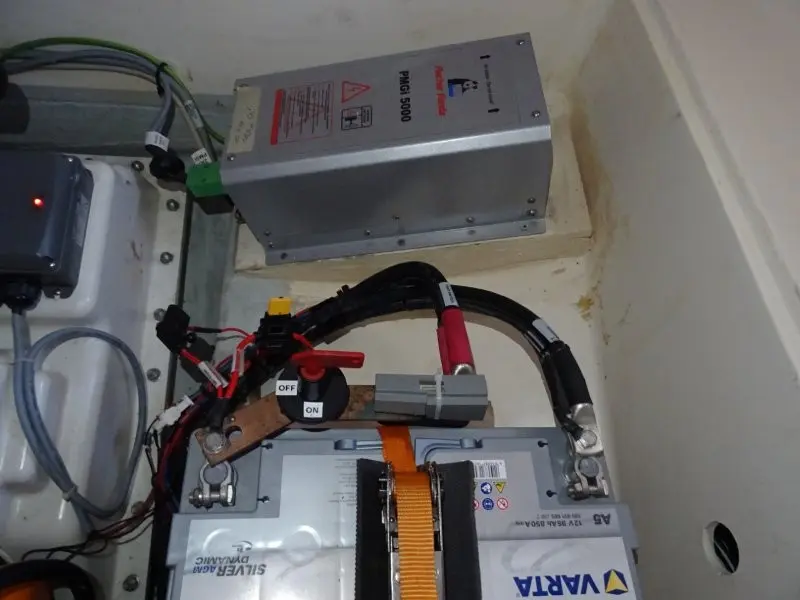 Batteries:Domestic: 3 x Rolls (128 Ah, new 08/2024)Engine: 1 x BoschBow/Stern Thruster: 2x Varta (95 Ah)Inverter: MasterVolt MASS/COMBI (1200–2400 W)Charger: MasterVolt (60 A)Solar: 3x Victron 185W (not yet installed)