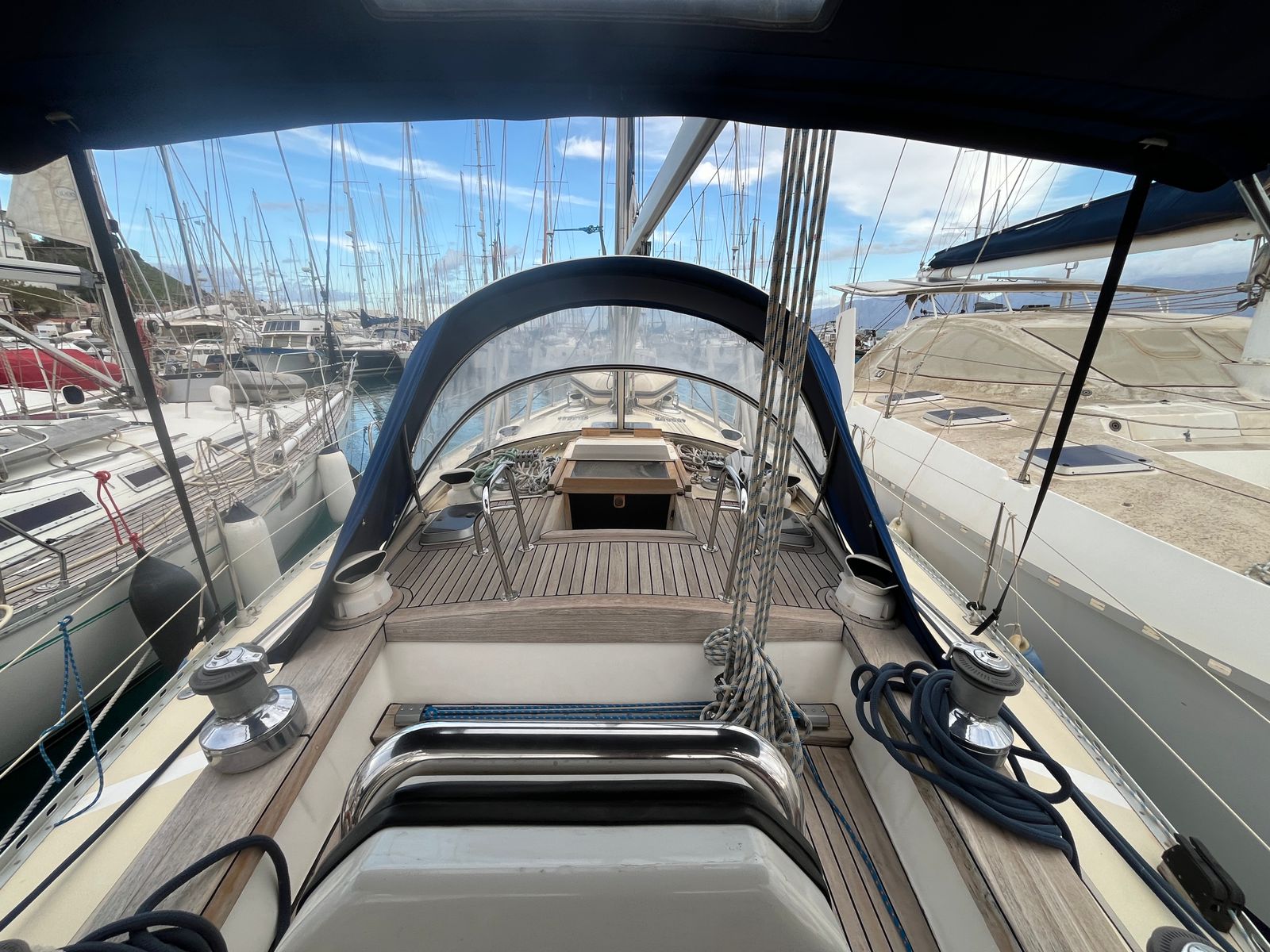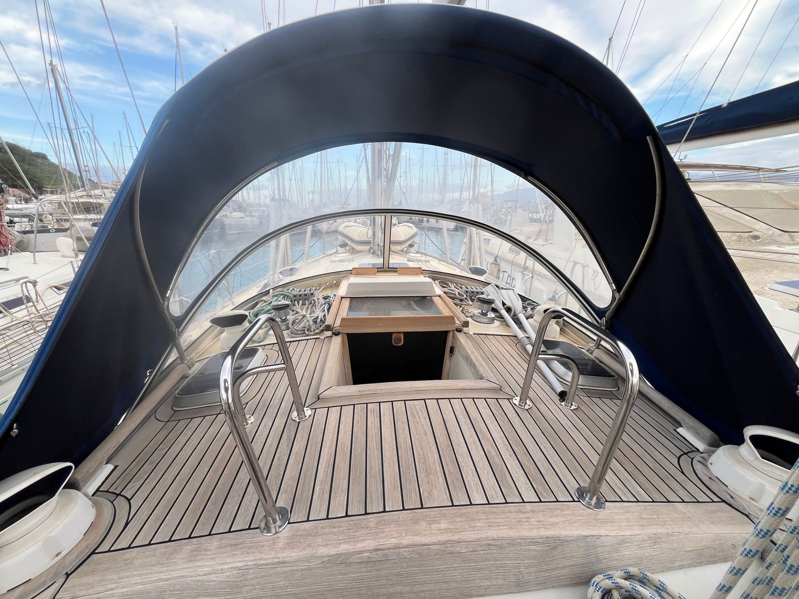 On deck, she is equally well prepared. An electric windlass, multiple anchors, full cockpit protection, and a comprehensive cruising inventory complete the package. She offers the space, equipment, and capability that discerning sailors expect from a serious ocean-going yacht.