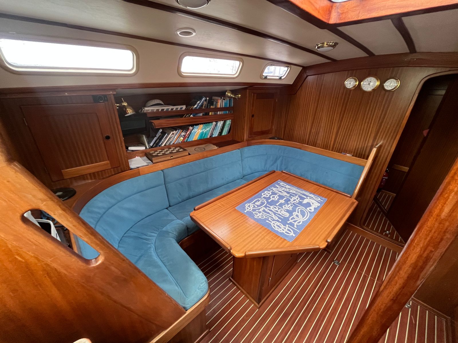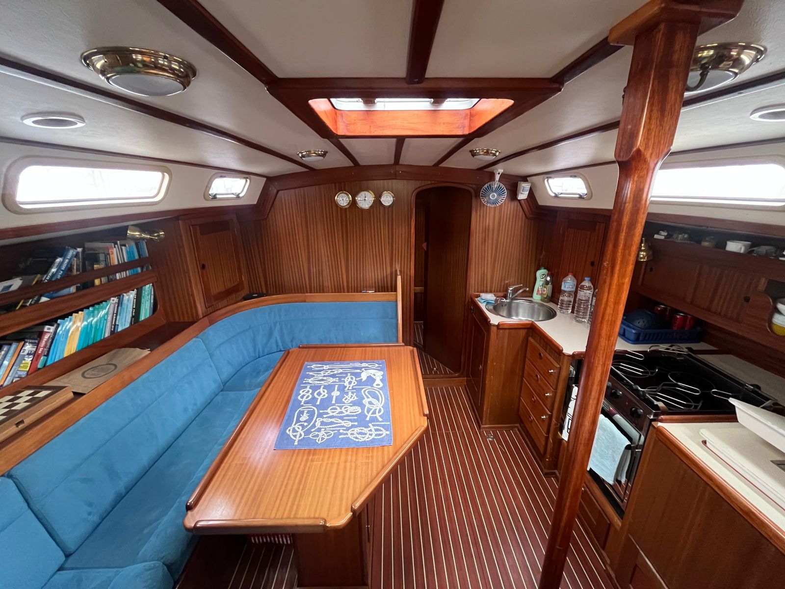 Below deck, the interior is warm, practical, and inviting. Accommodation is arranged for up to five guests in three cabins, including a generous aft master suite with en-suite facilities. Rich mahogany joinery and Alcantara upholstery create a refined atmosphere, while the layout remains functional for extended living aboard.