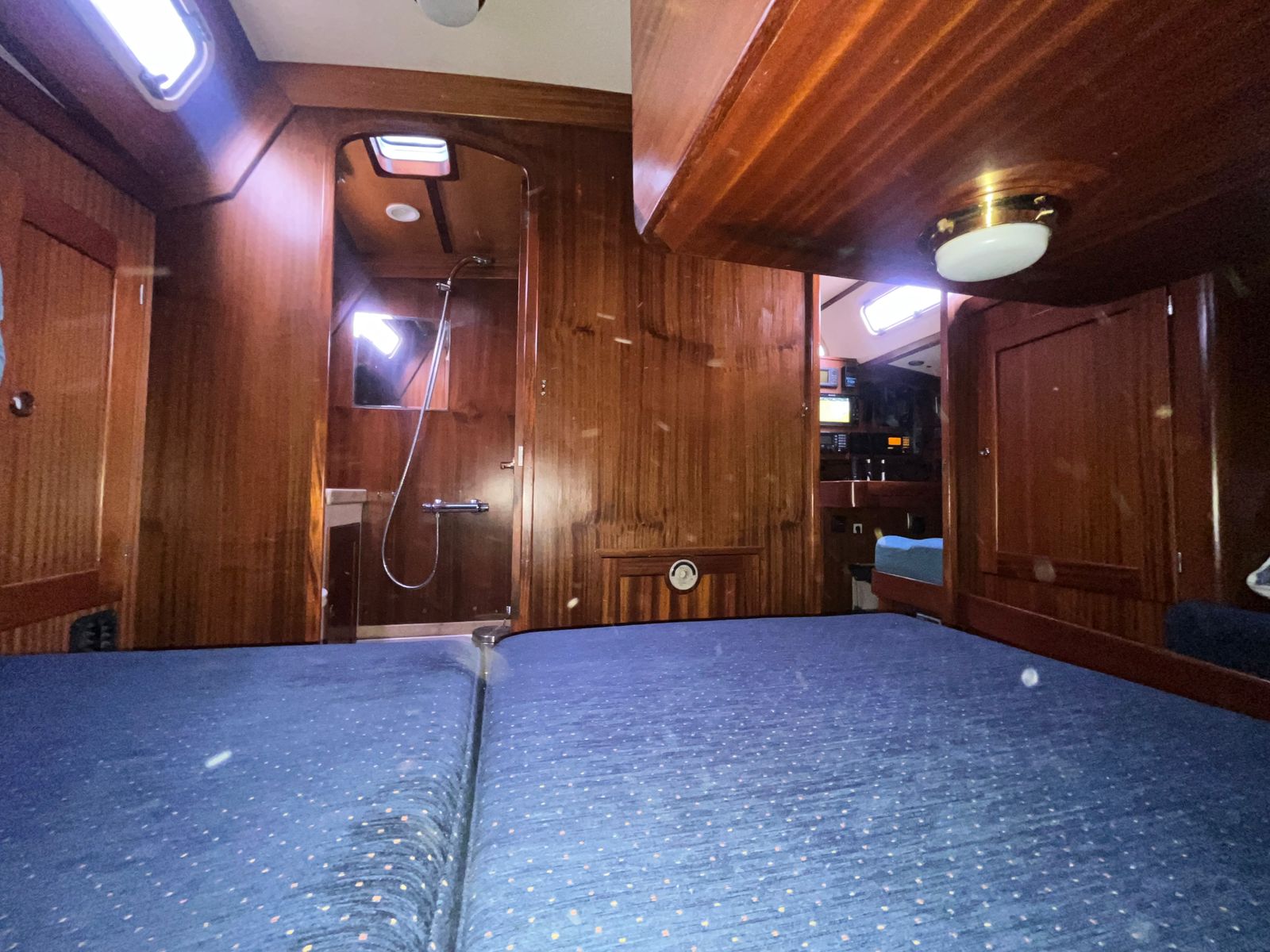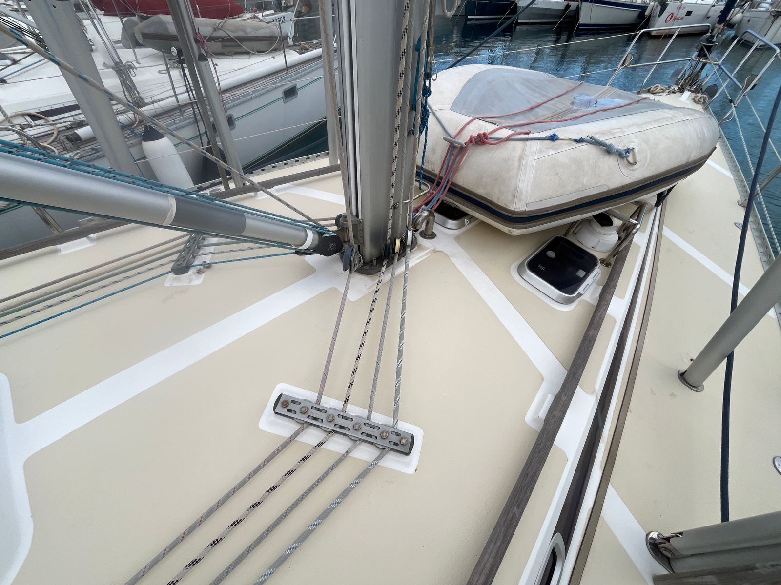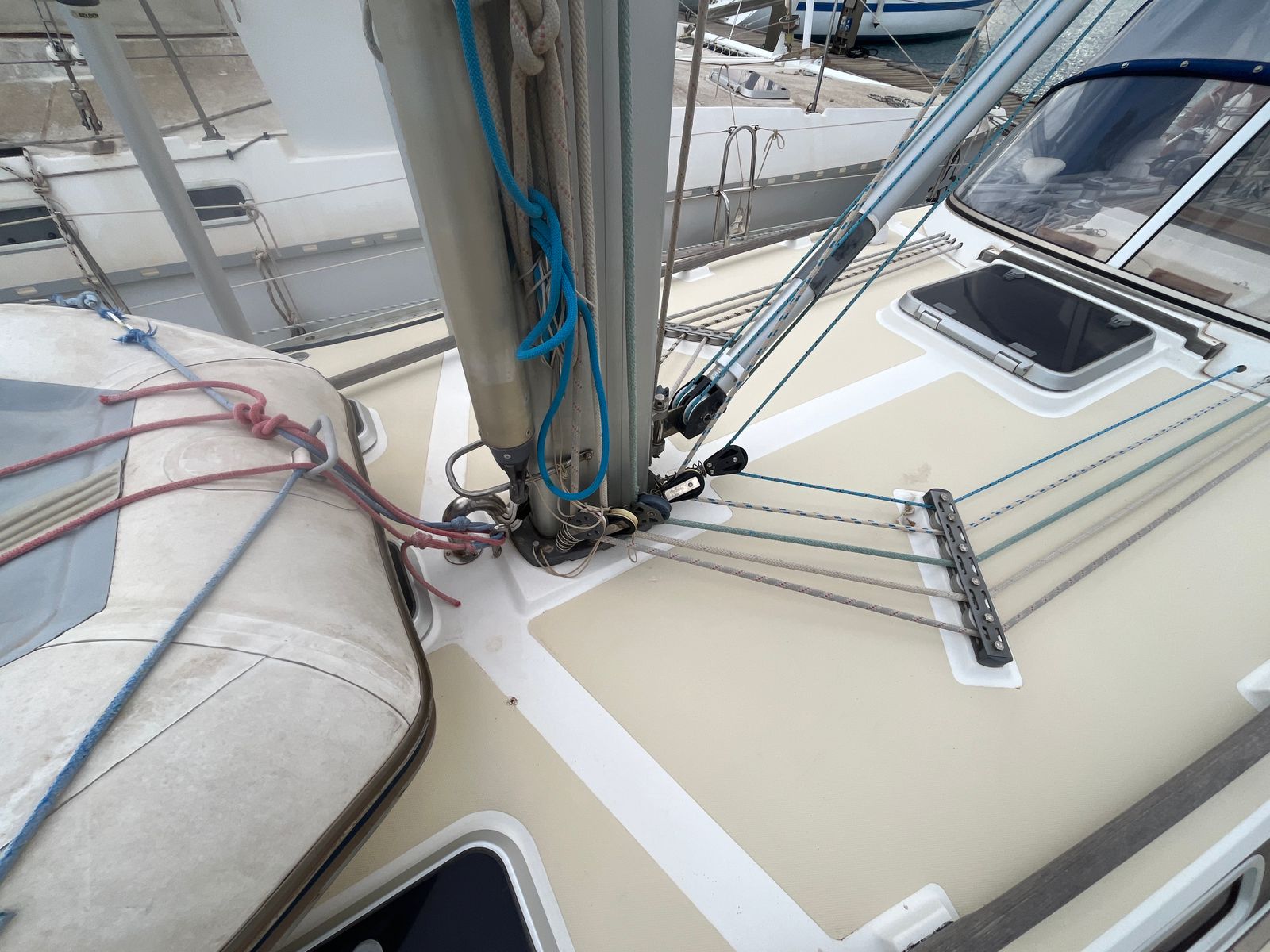Her sloop rig features a Sparcraft aluminium mast and updated standing rigging from 2019. The sail plan is both versatile and easy to manage, with an in-mast furling mainsail and multiple furling headsails. This setup supports short-handed cruising while still offering the flexibility and performance expected from a capable offshore yacht.