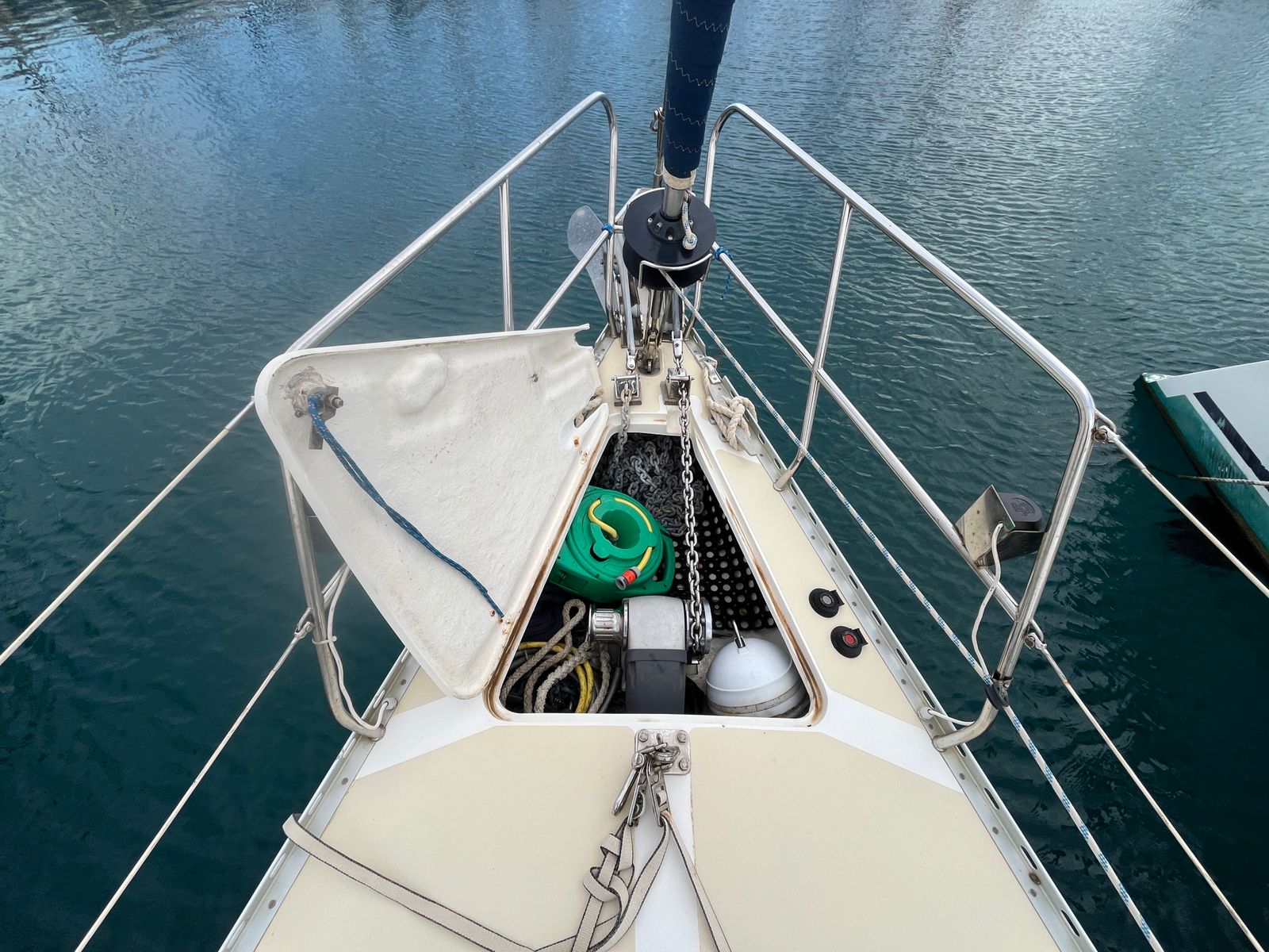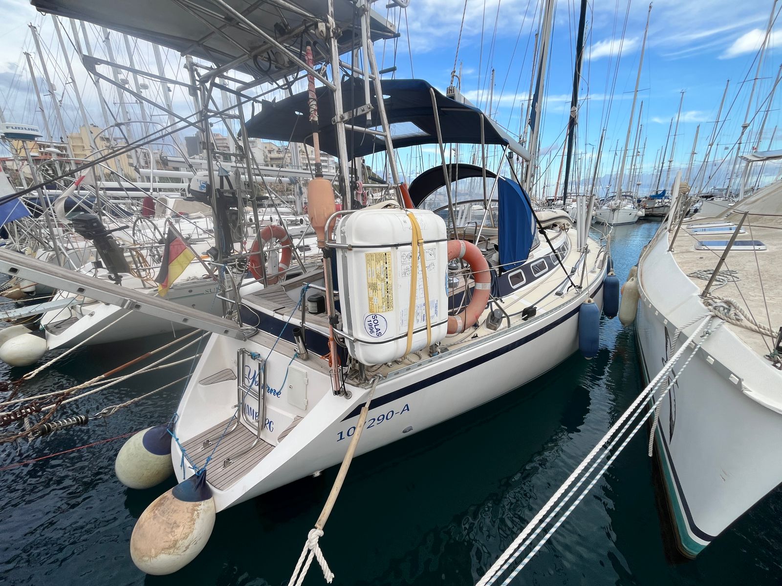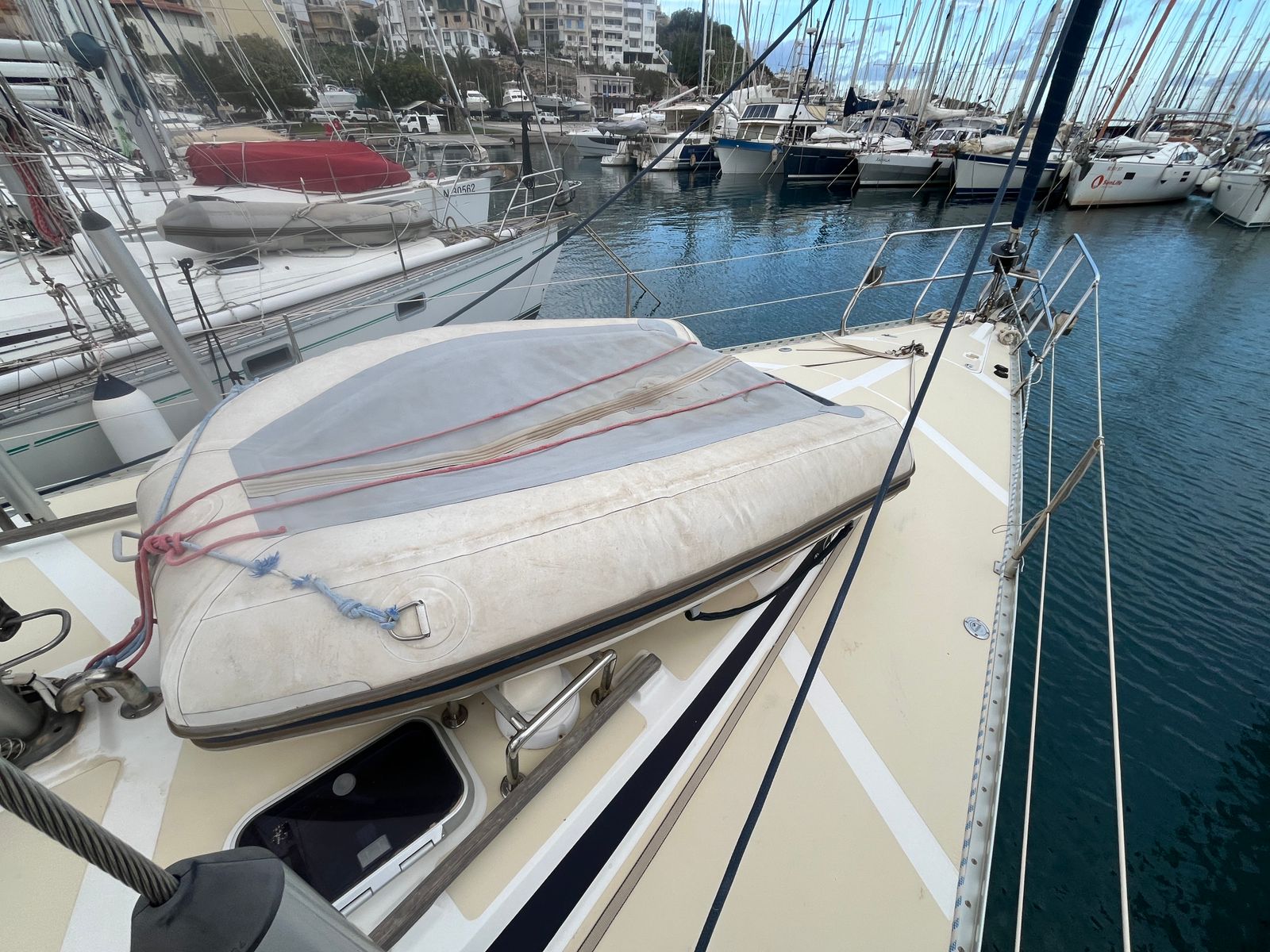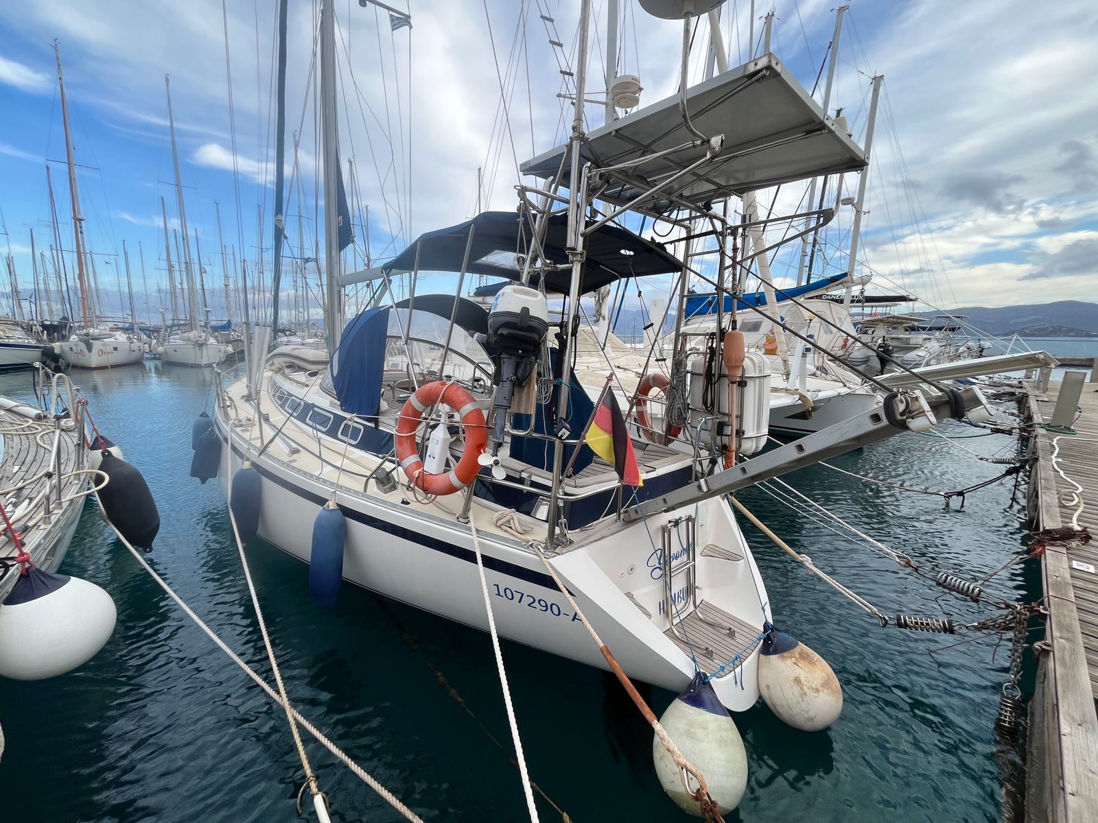 Her sloop rig features a Sparcraft aluminium mast and updated standing rigging from 2019. The sail plan is both versatile and easy to manage, with an in-mast furling mainsail and multiple furling headsails. This setup supports short-handed cruising while still offering the flexibility and performance expected from a capable offshore yacht.