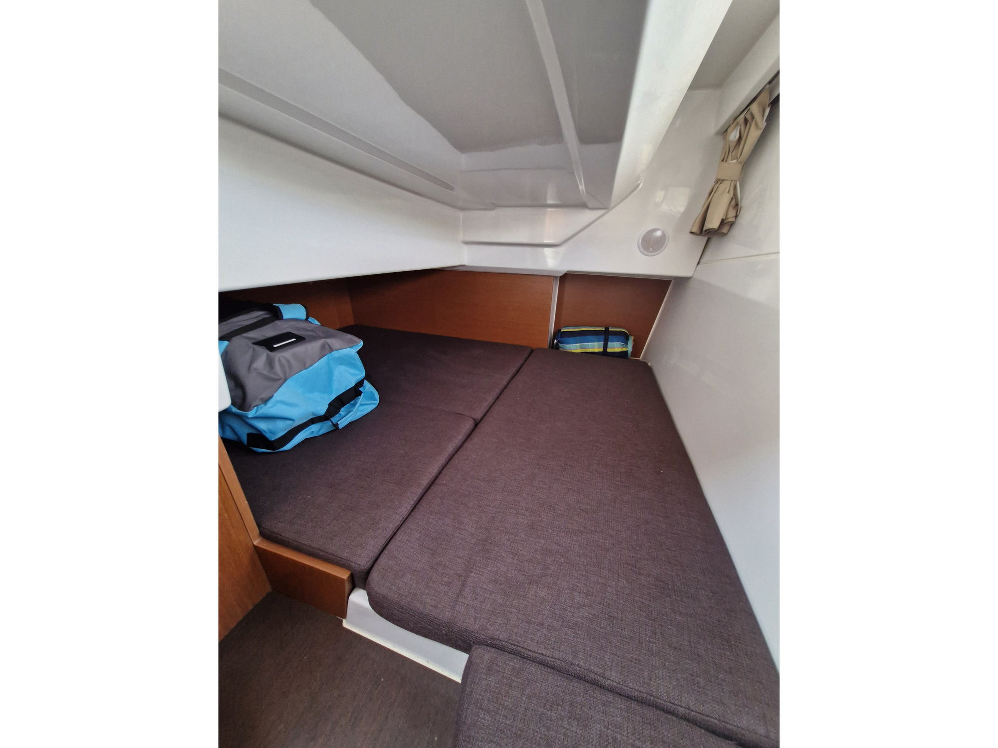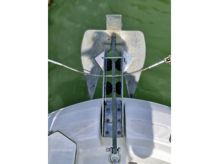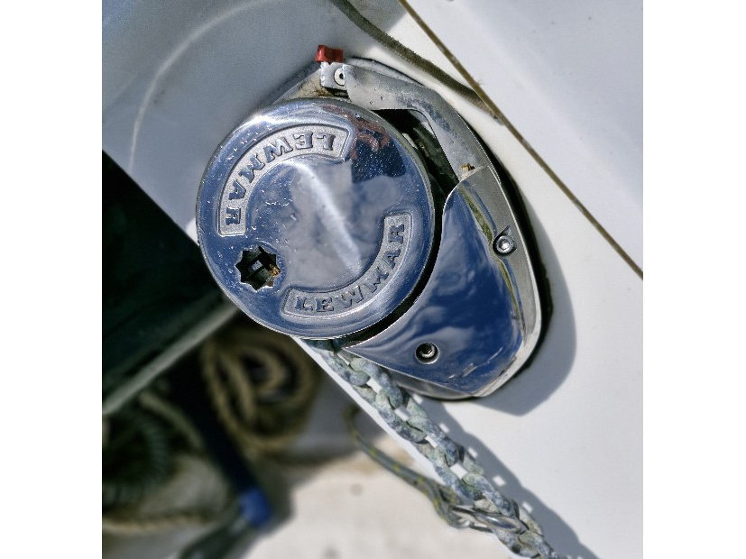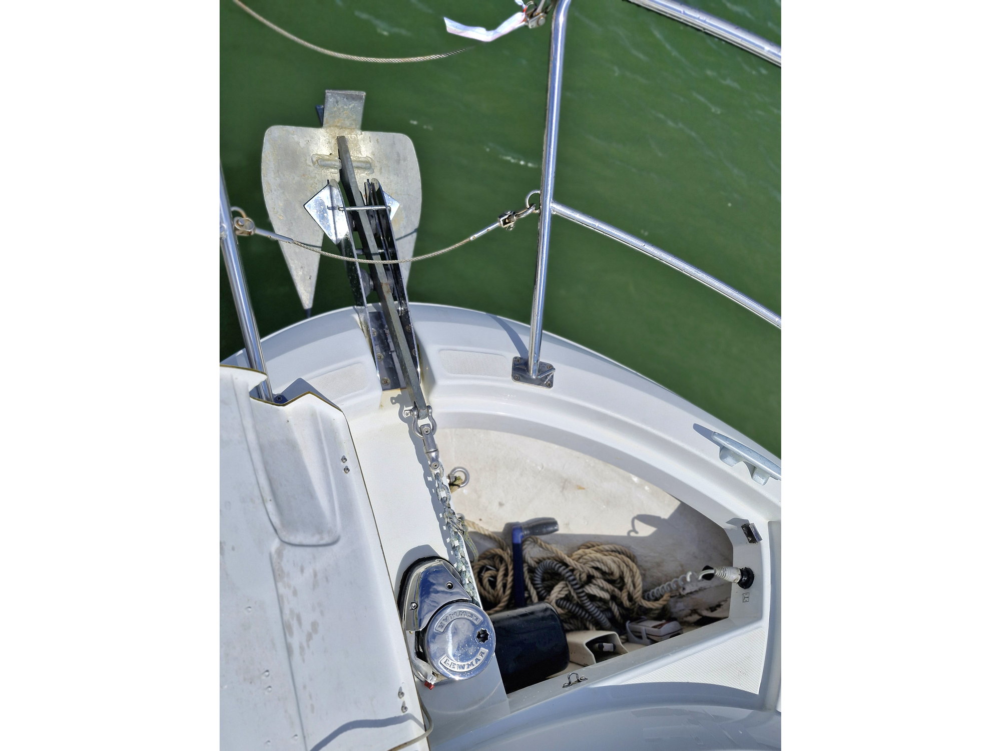 On deck, she is equipped with a Lewmar electric windlass, CQR/Delta anchor with 12m chain, deck shower, Garmin plotter, VHF, and a 3D Light 2.8m tender with Suzuki 2.5HP outboard (2023).