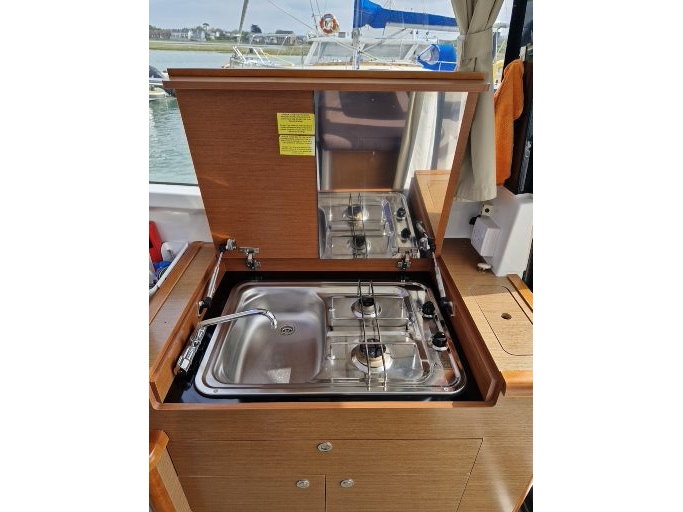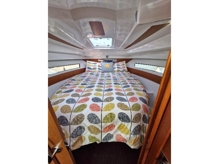 Accommodation sleeps six in two cabins plus a convertible saloon. The forward master cabin features a comfortable double berth, with a second double in the aft guest cabin. The bright, open-plan saloon includes a starboard helm, convertible dining table, and linear galley, all benefiting from generous 1.98m headroom. A separate heads compartment with shower completes the layout.