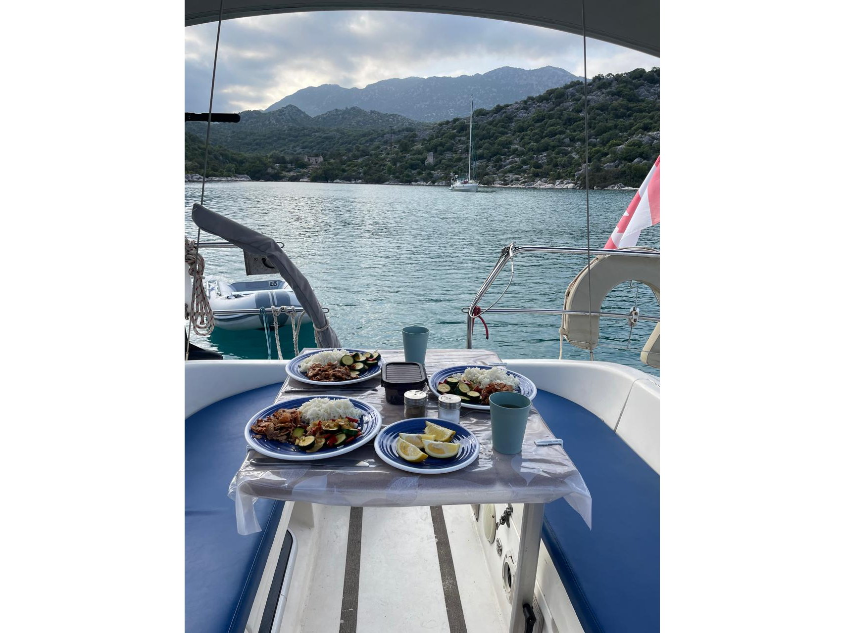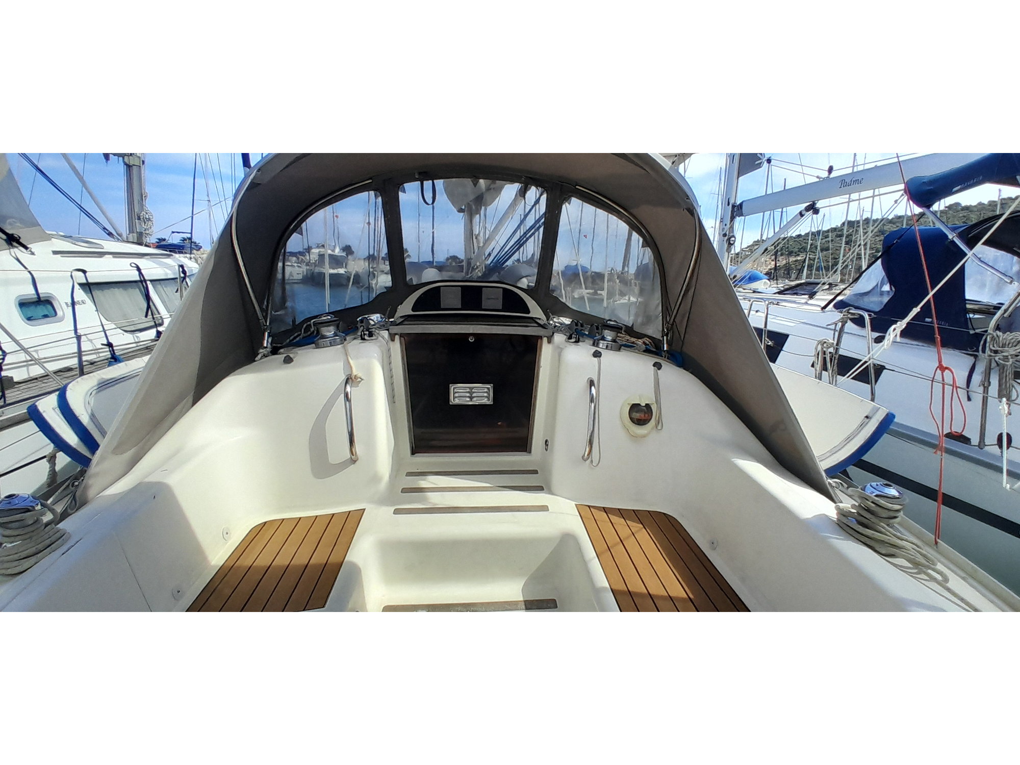 On deck she is well equipped for relaxed cruising. Lewmar halyard and genoa winches manage sail handling, while a Lofrans electric windlass with two remotes makes anchoring simple. The inventory also includes bow and stern anchors, swimming platform, ladder, deck shower, and passarelle. Navigation equipment features a B&G Vulcan 7-inch chart plotter, Simrad TP32 tillerpilot autopilot, Garmin wind indicator, speed and log instrument, Plastimo bulkhead compass, and ICOM VHF. The sale also includes a 2.40m Freesun tender with Bison NRS 40L electric outboard.